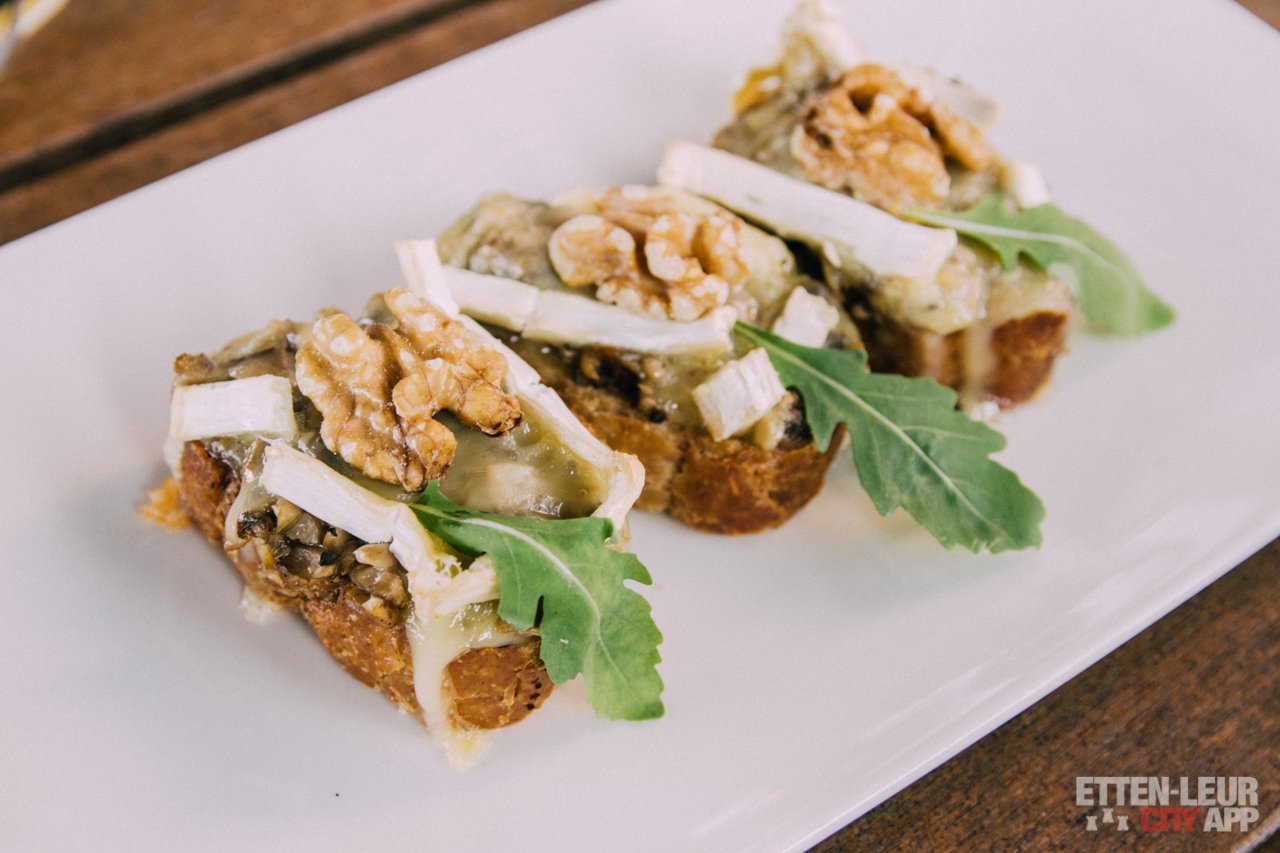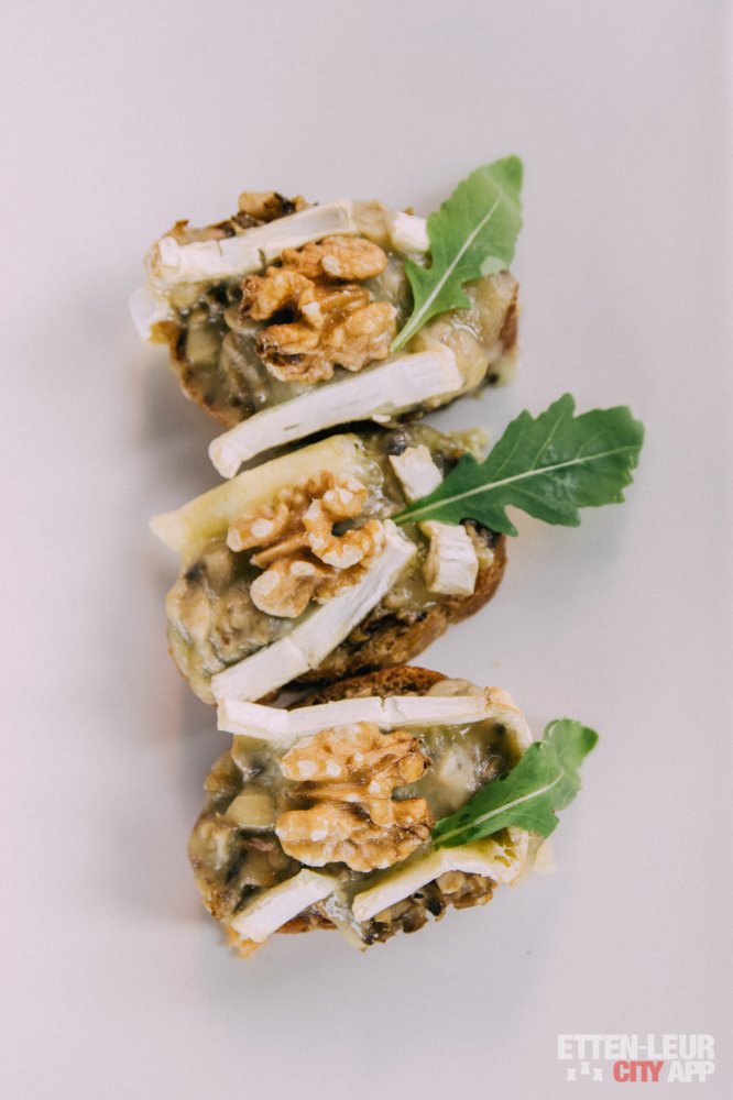 De brie bruscetta's zijn heerlijke krokante sneetjes stokbrood met gesmolten brie en een tapenade van knoflookchampignons en zien er leuk opgemaakt uit.
