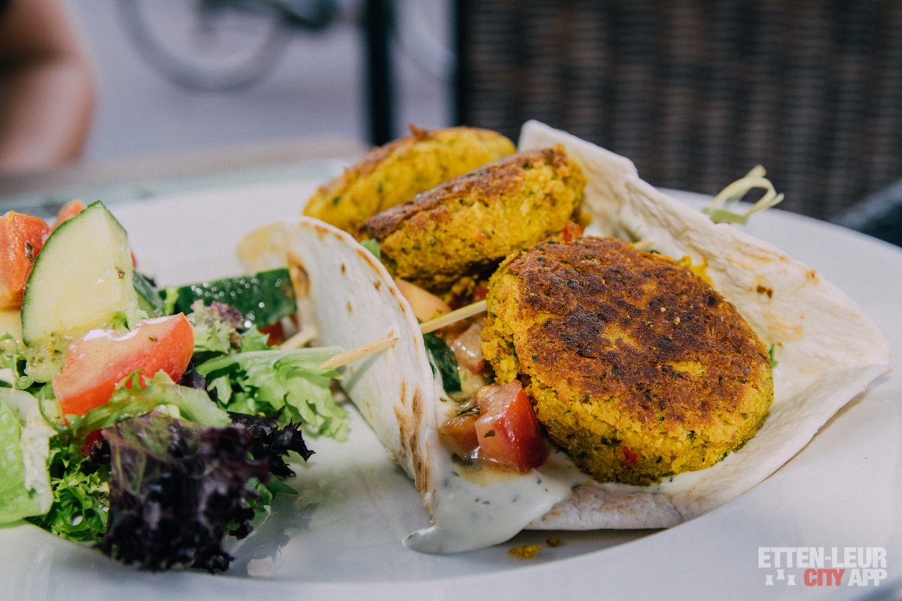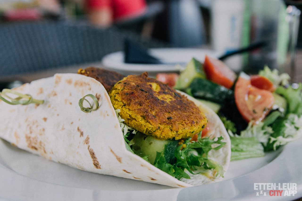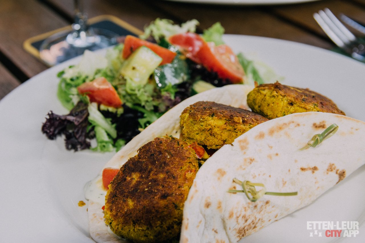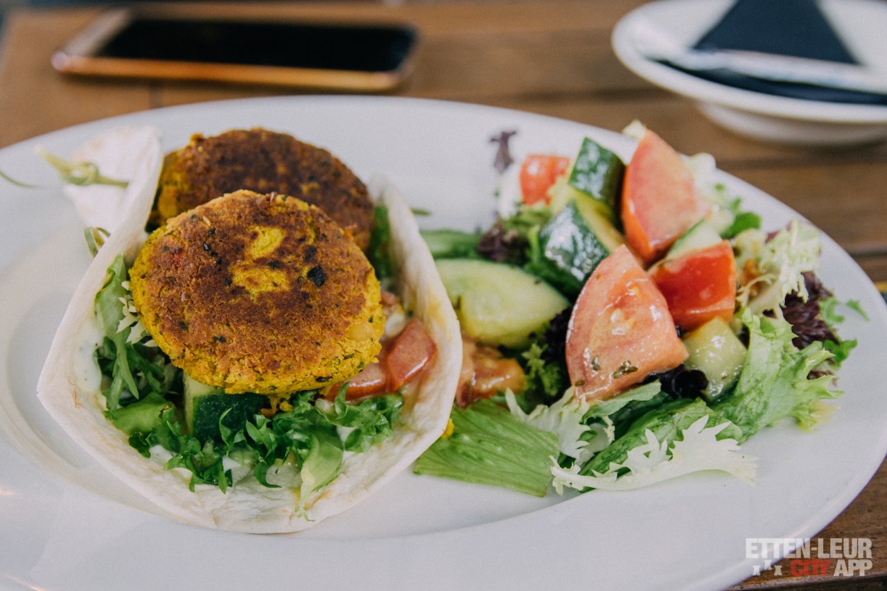 Als hoofdgerecht kiezen we voor een vegetarisch gerecht en zijn we benieuwd naar de bekende spareribs van The Butler. Het vegetarische gerecht is een wrap, gevuld met huisgemaakte falafel, tomaat, komkommer, frisse dressing en een gemengde salade.