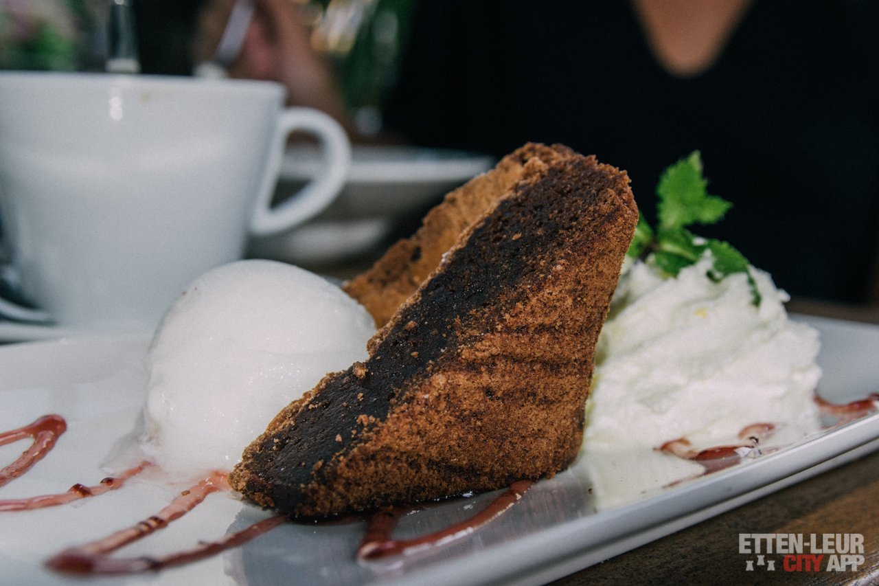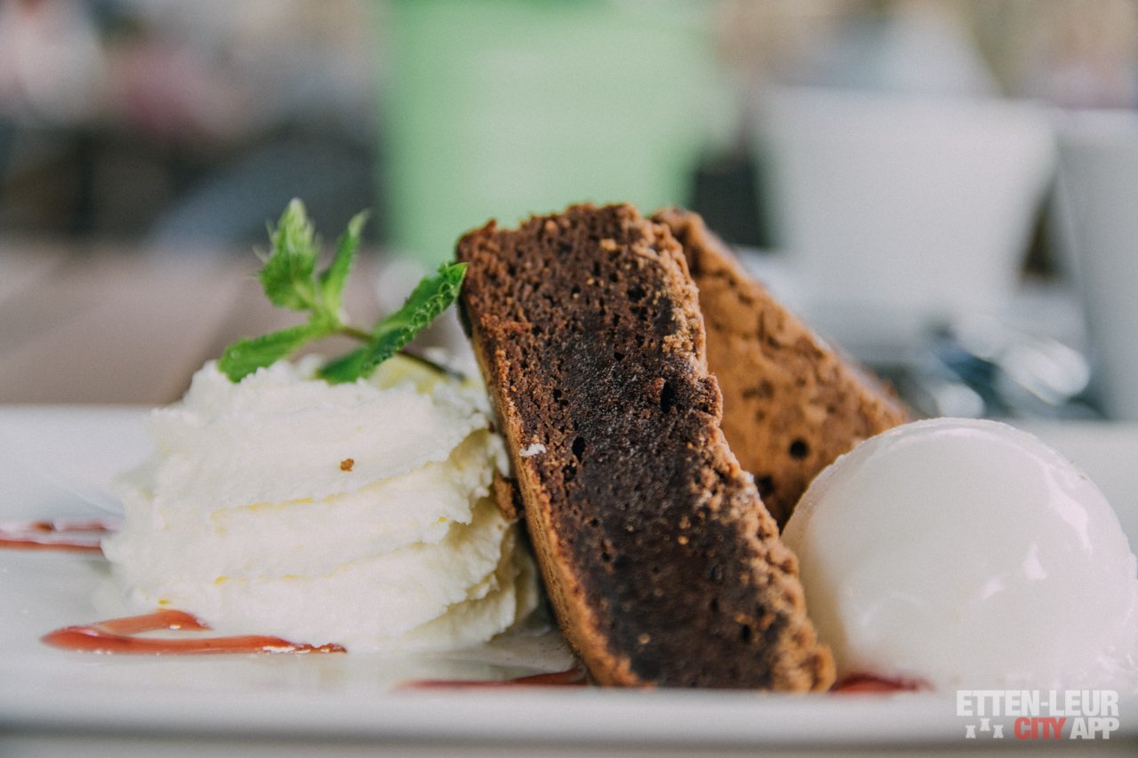 De huisgemaakte brownie in combinatie met citroen sorbetijs, frambozensaus en slagroom is lekker fris en zoet tegelijk.