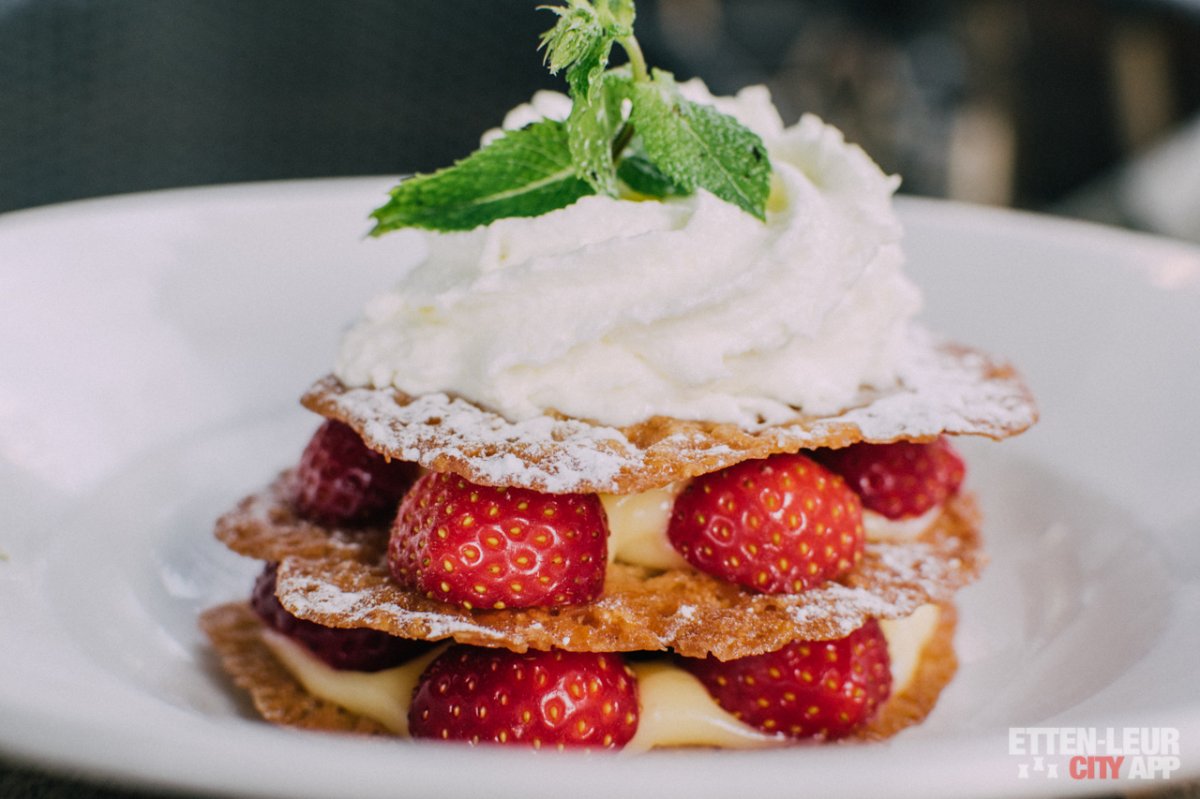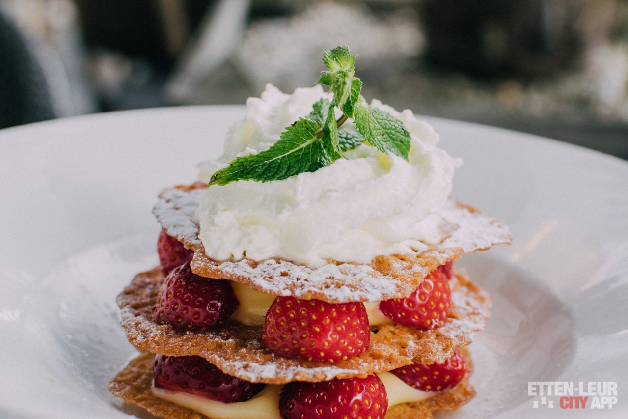 We nemen even de tijd om een keuze te maken voor het nagerecht. Uiteindelijk gaan we voor een aardbeientorentje en de huisgemaakte brownie. Het torentje ziet er verrassend leuk uit en wordt geserveerd met kletskoppen, gele room, poedersuiker en slagroom.