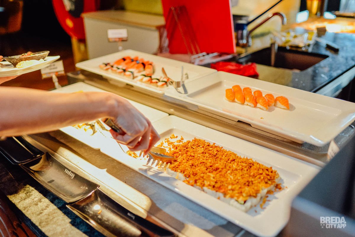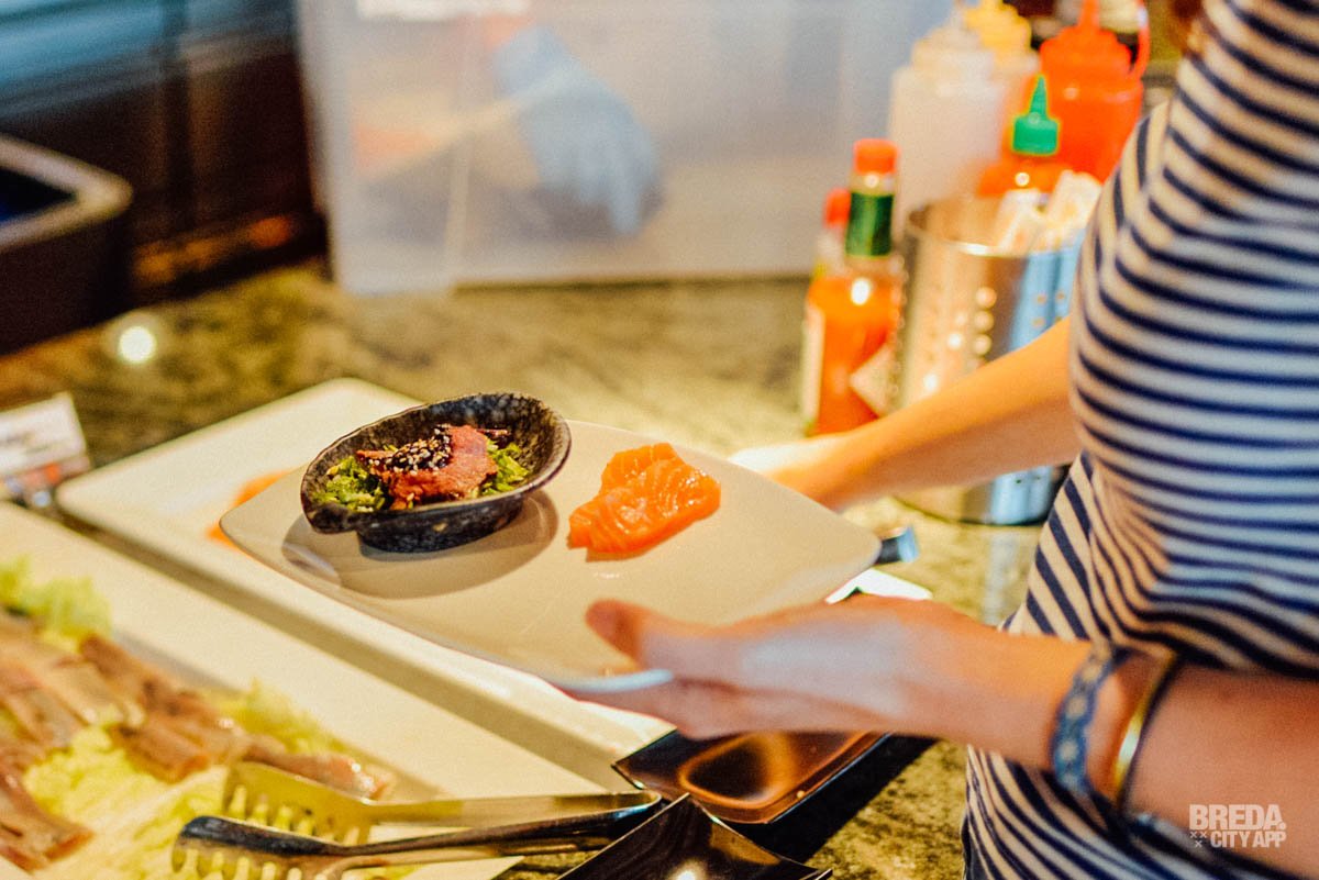 Vanaf deze balie worden we door een gastvrouw begeleid naar onze tafel. Onderweg vertelt ze ons uitgebreid over alle verschillende gerechtjes en producten die ze serveren. Zo lopen we langs een kookeiland met verschillende soorten vis en sushi. Je begrijpt, daar zijn wij al helemaal verkocht.