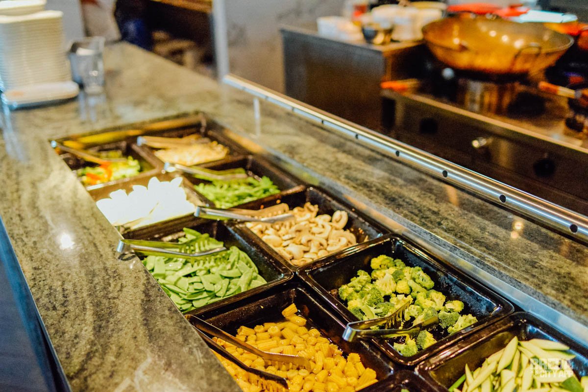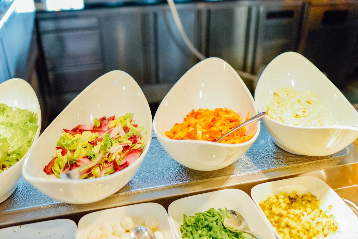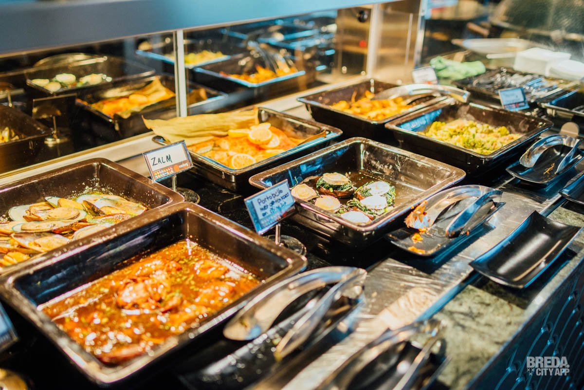 Daarna door naar en kookeiland met verschillende voorgerechten; carpaccio, olijven, een variatie aan salades en een heuse saladebar. Ook zijn daar verschillende soorten soepen te vinden, deze kun je zelf op smaak brengen met verschillende kruiden. Tenslotte komen we langs de warme gerechten. Veel vlees, groentes en ook een prachtig wok gedeelte waar je jouw maaltijd kunt laten wokken.
