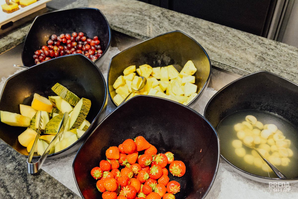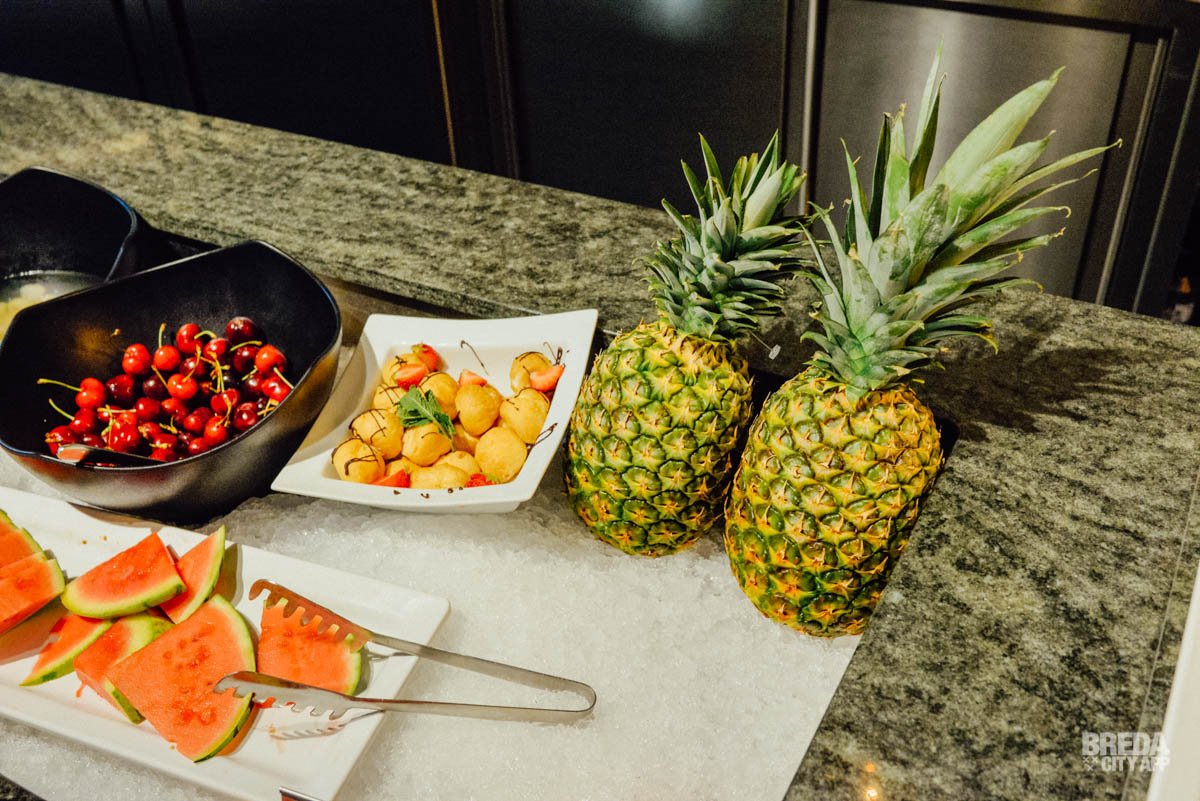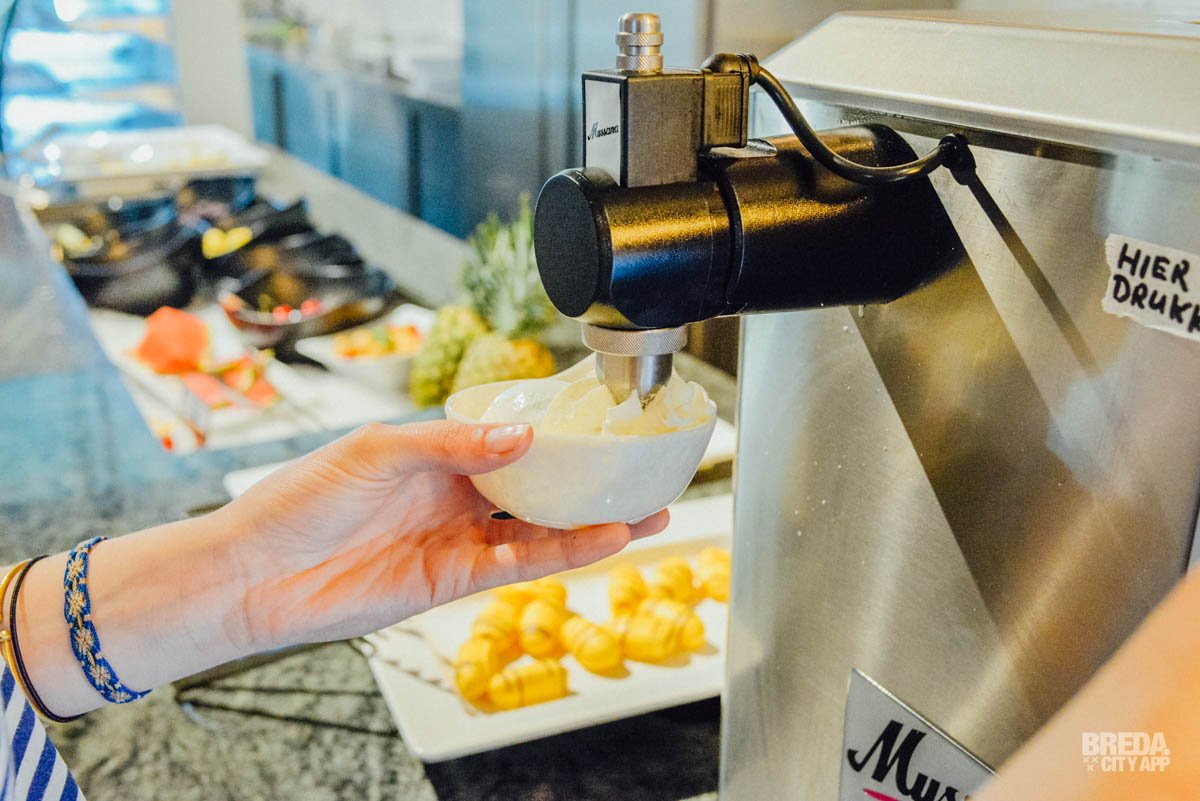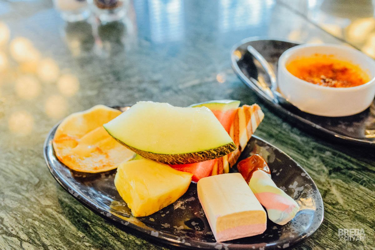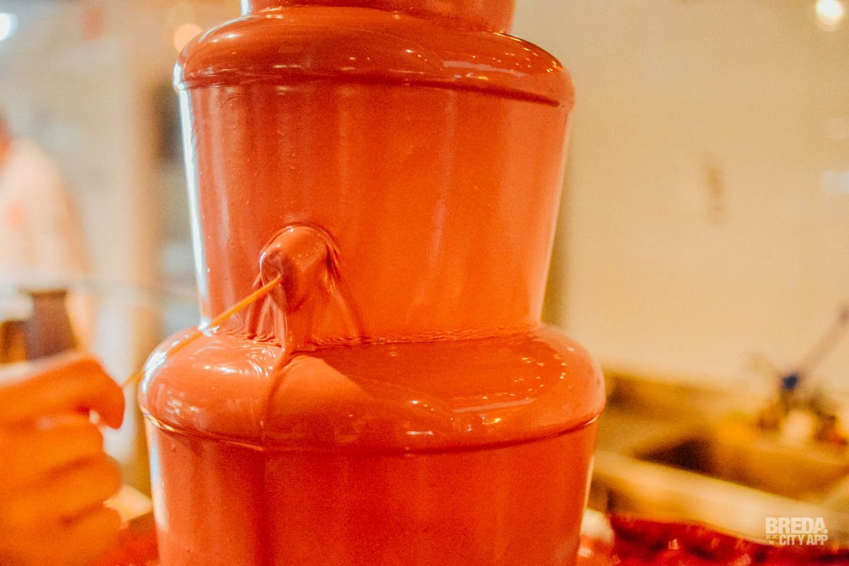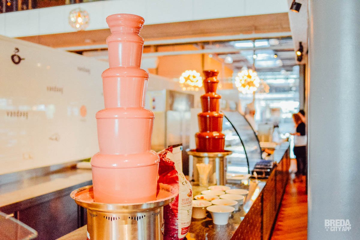 Dan is het eindelijk tijd voor het hoogtepunt van de avond. Voor mij dan, want ik ben verliefd op alles wat zoet is en toetjes heet. Het dessert buffet is niet heel groot maar wel erg uitgebreid. Zo zijn er pannenkoekjes, is er crème brulée en zijn er twee chocolade fonteinen. Daarnaast zijn er verschillende soorten ijs, vers fruit en veel gebak! Jum! De chocolade fontein is extra bijzonder, deze is namelijk van de pas ontdekte Ruby chocolade. Restaurant Vandaag heeft in Nederland de primeur met deze Ruby-fontein. Dat moeten we natuurlijk proberen, de chocolade is heerlijk! Echt anders, er is een licht zuurtje in te herkennen wat de chocolade iets fris geeft. Wij zijn verkocht, roze en chocolade is sowieso een goede combi wat ons betreft.