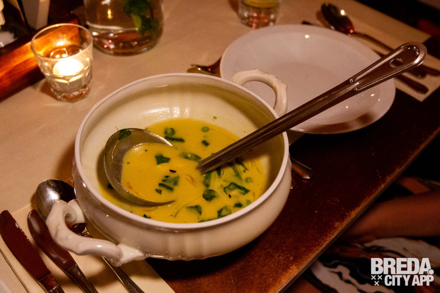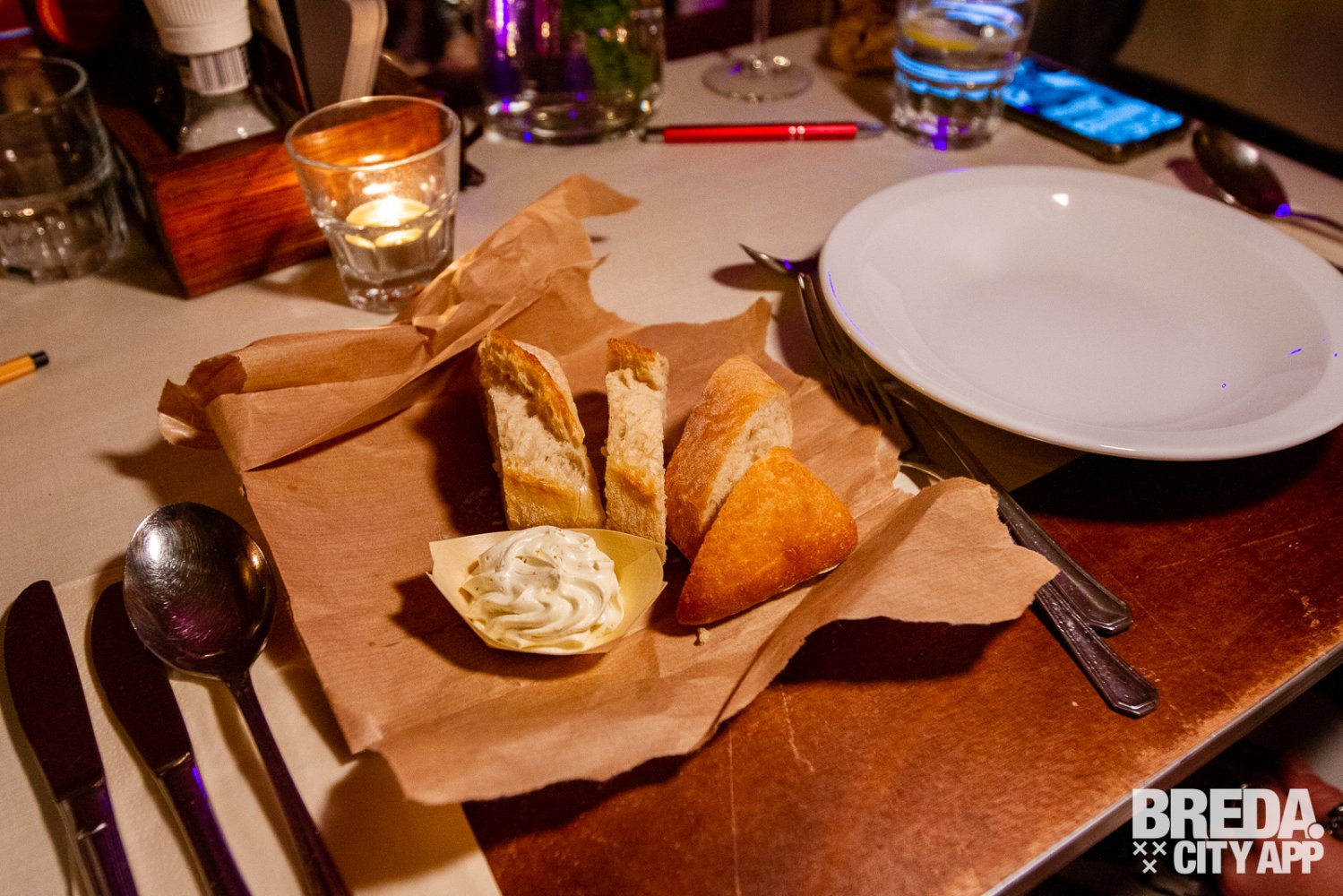 Op onze tafel staat de menukaart, waarop we kunnen lezen wat we mogen gaan proeven vanavond. Het onvangst- en het nagerecht is voor iedereen hetzelfde, maar bij het voor- en hoofdgerecht  heb je de keus uit vlees, vis of vegetarisch. Naast de menukaart staat er ook al een schaaltje met brood en kruidenboter op de tafel en worden wij voorzien van wat te drinken.