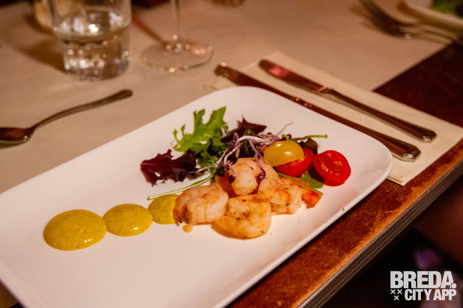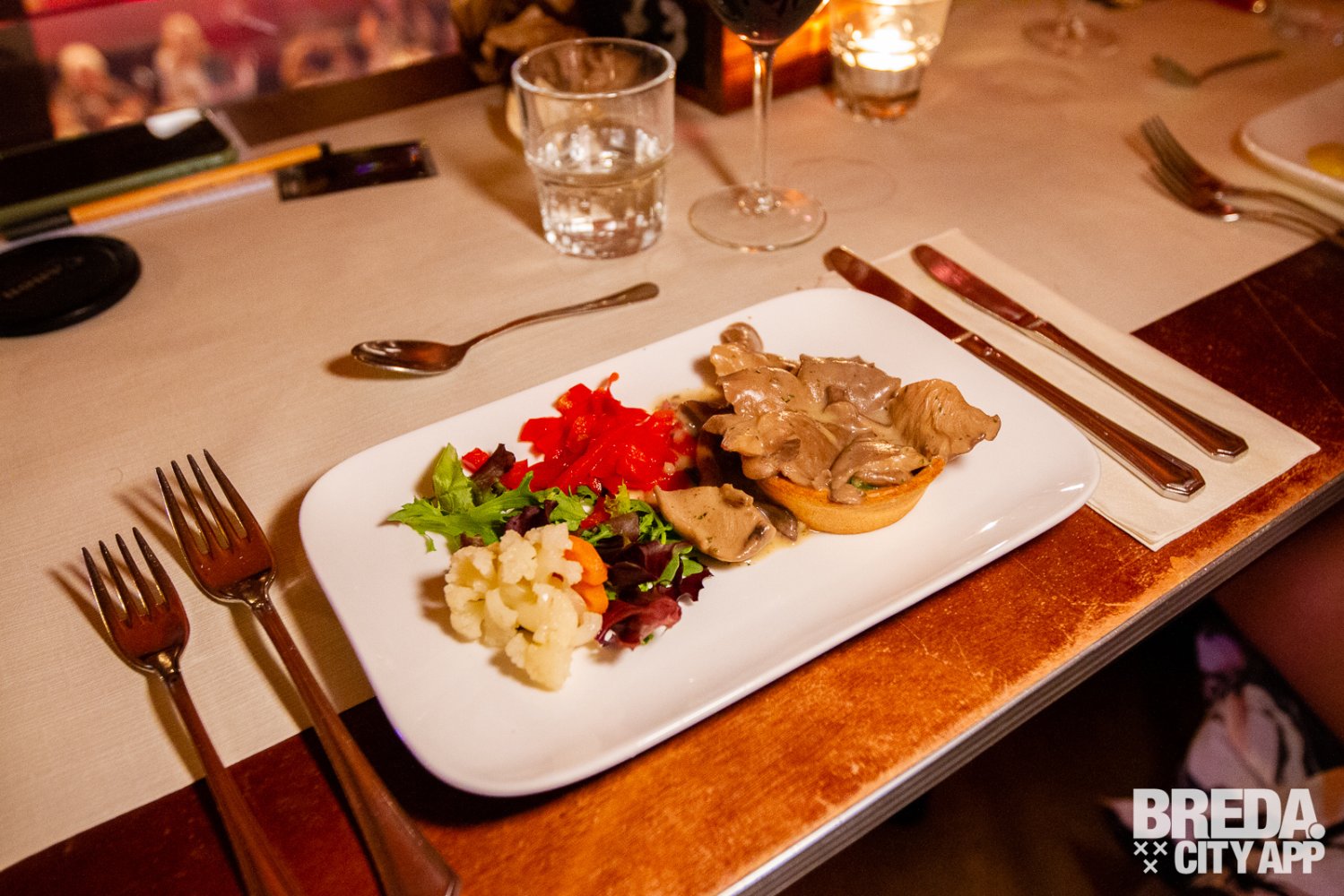 Voor het tweede gerecht, ofwel het voorprogramma genoemd, kregen we een scampi cocktail en een bourguinon van paddenstoelen. De scampi cocktail wordt geserveerd met salade, kerriemayonaise en een crumble. De bourguinon van paddenstoelen is gemaakt met een kruidige jus en zit in een krokant bakje met daarbij een salade. Tot nu toe een erg smakelijk voorprogramma!