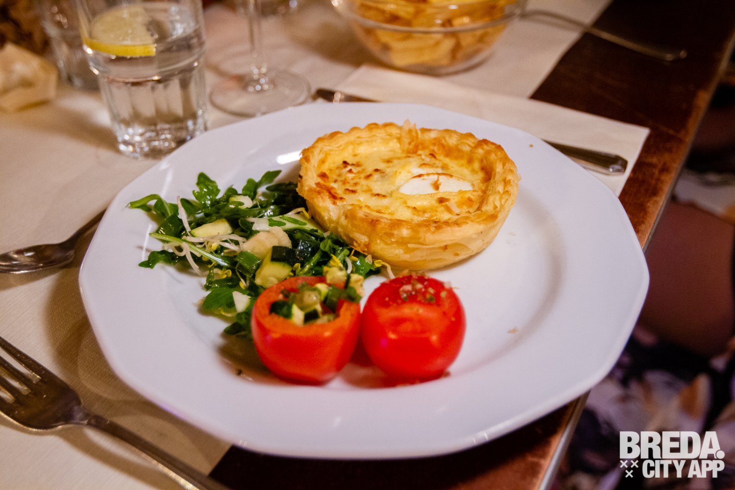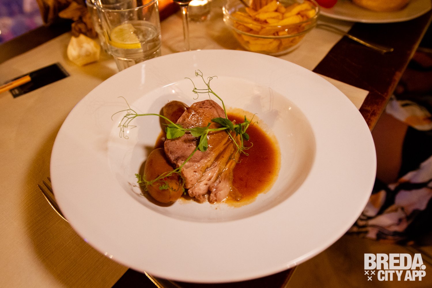 Als hoofdgerecht ontvangen we de slow cooked sucade en een quiche met geitenkaas en gevulde tomaat. De sucade wordt geserveerd met een oriëntaalse jus en groentechips hierbij krijg je er gepofte aardappels bij. Het vlees is erg mals en de jus daarbij maakt het erg smaakvol. De quiche van geitenkaas wordt geserveerd met een zoetzure salade. Het krokante bladerdeeg en de zachte geitenkaas zijn natuurlijk een geweldige combinatie. Per twee personen krijg je er een schaaltje met friet en mayonaise bij.