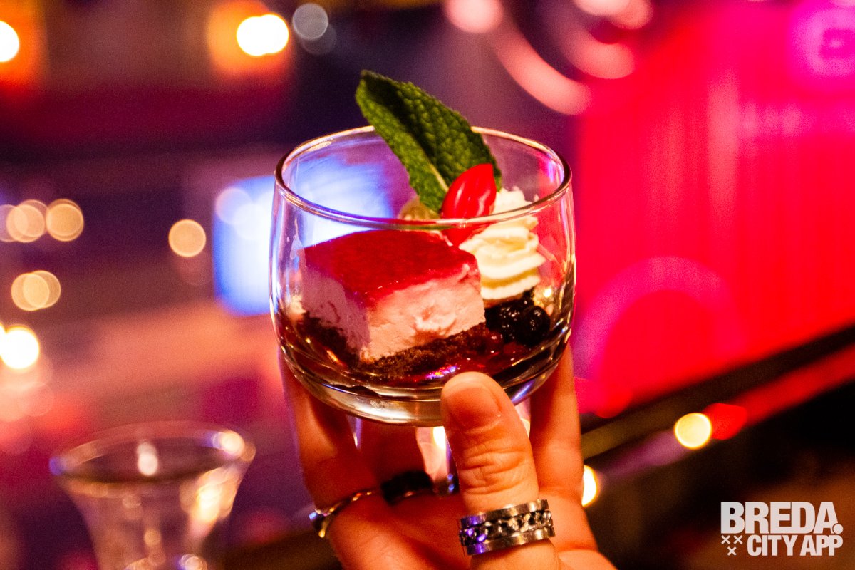 Na het hoofdgerecht volgen nog een aantal acts waar we vol verbazing naar kijken. Het einde van de show nadert en vanderWal meldt dat het tijd is voor de grande finale! Het dessert wordt geserveerd en vanuit de coulissen op het podium komt het personeel met schalen met vuurwerk naar buiten lopen. Een spectaculairder dessert dan dit krijg je niet! Een kersenbavarois met een vruchtencoulis en slagroom, geserveerd in een prachtig glas. De kersen proef je enorm goed en deze zoetigheid is dé perfecte afsluiter van het diner.