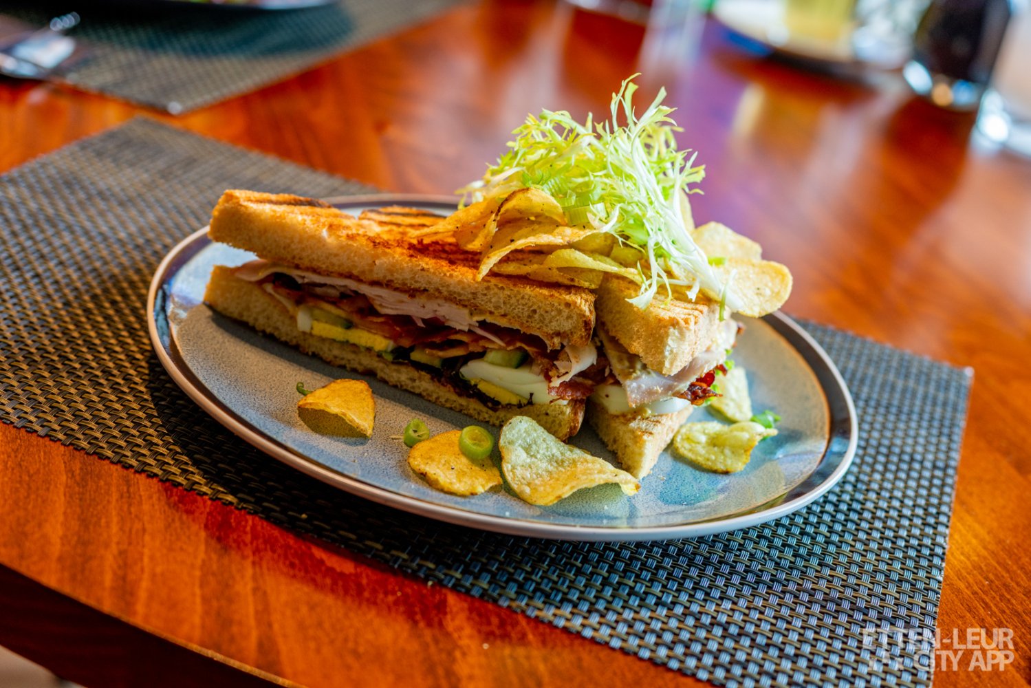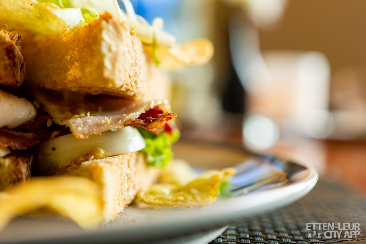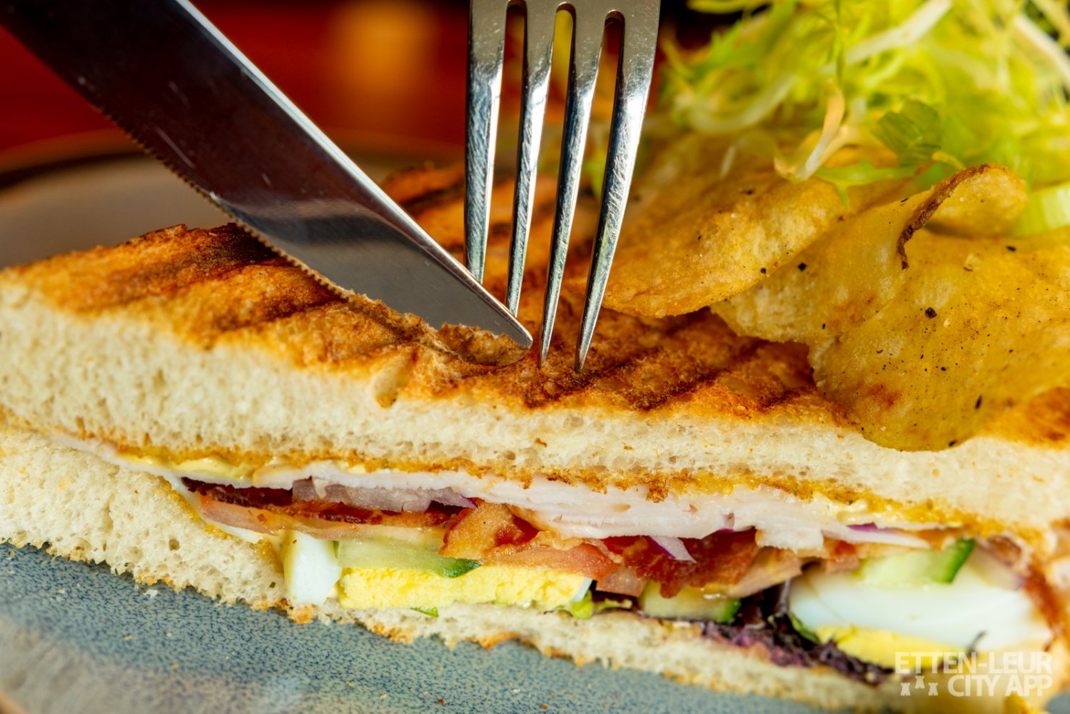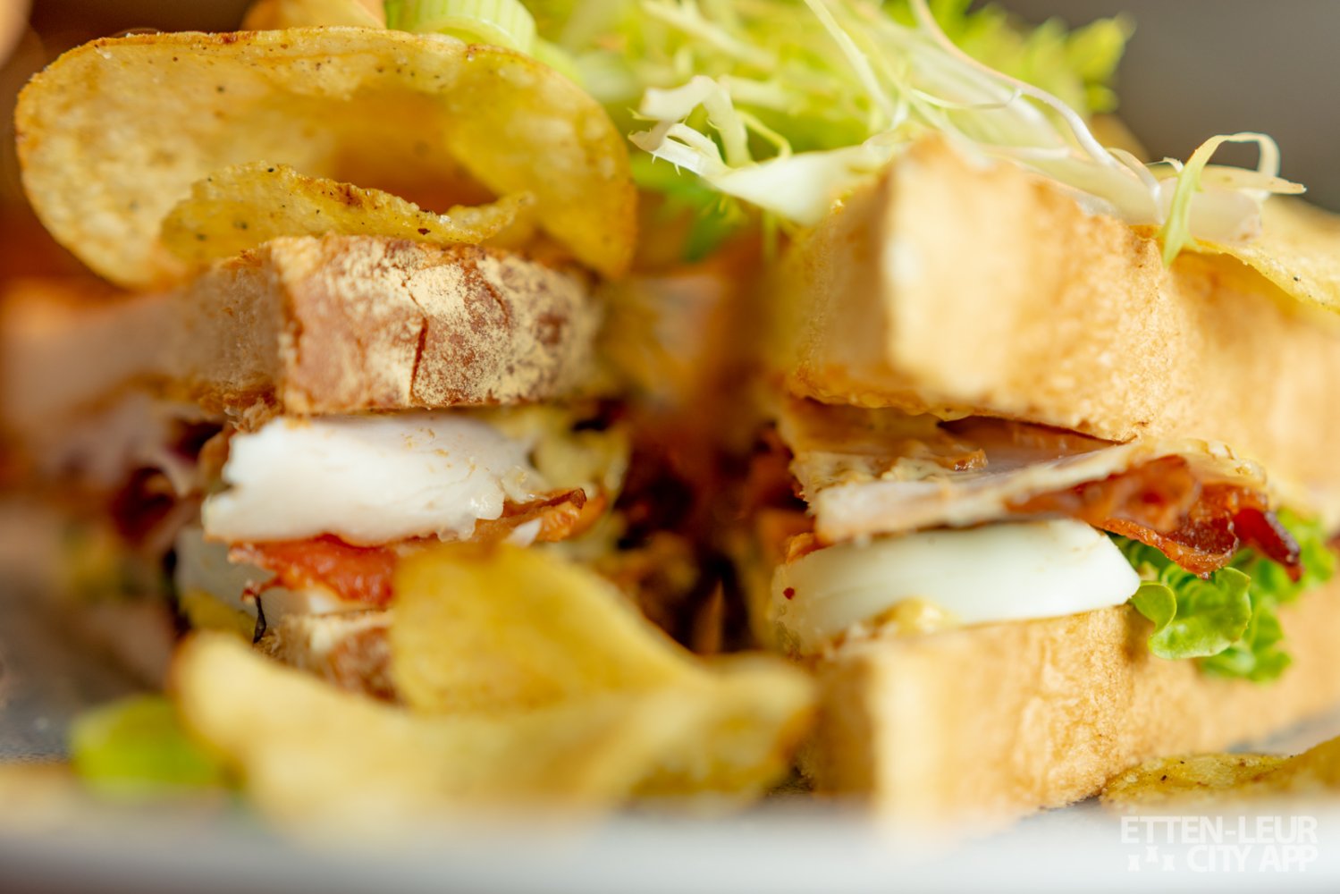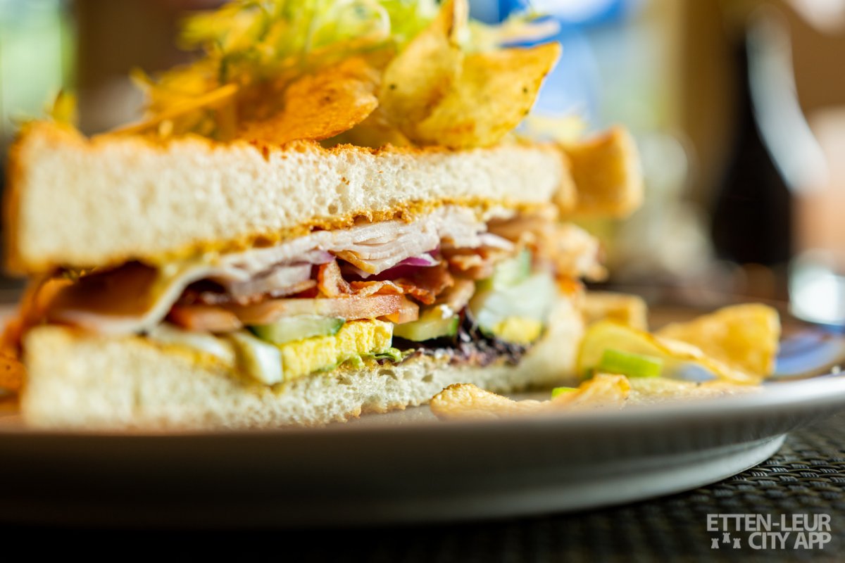 Wij kiezen voor een Classic Club Sandwich en een Geitenkaas salade. Beide gerechten zien er prachtig uit. De sandwich is royaal belegd met kip, bacon, tomaat, ei, sla, rode ui, gekruide mayonaise en chips.