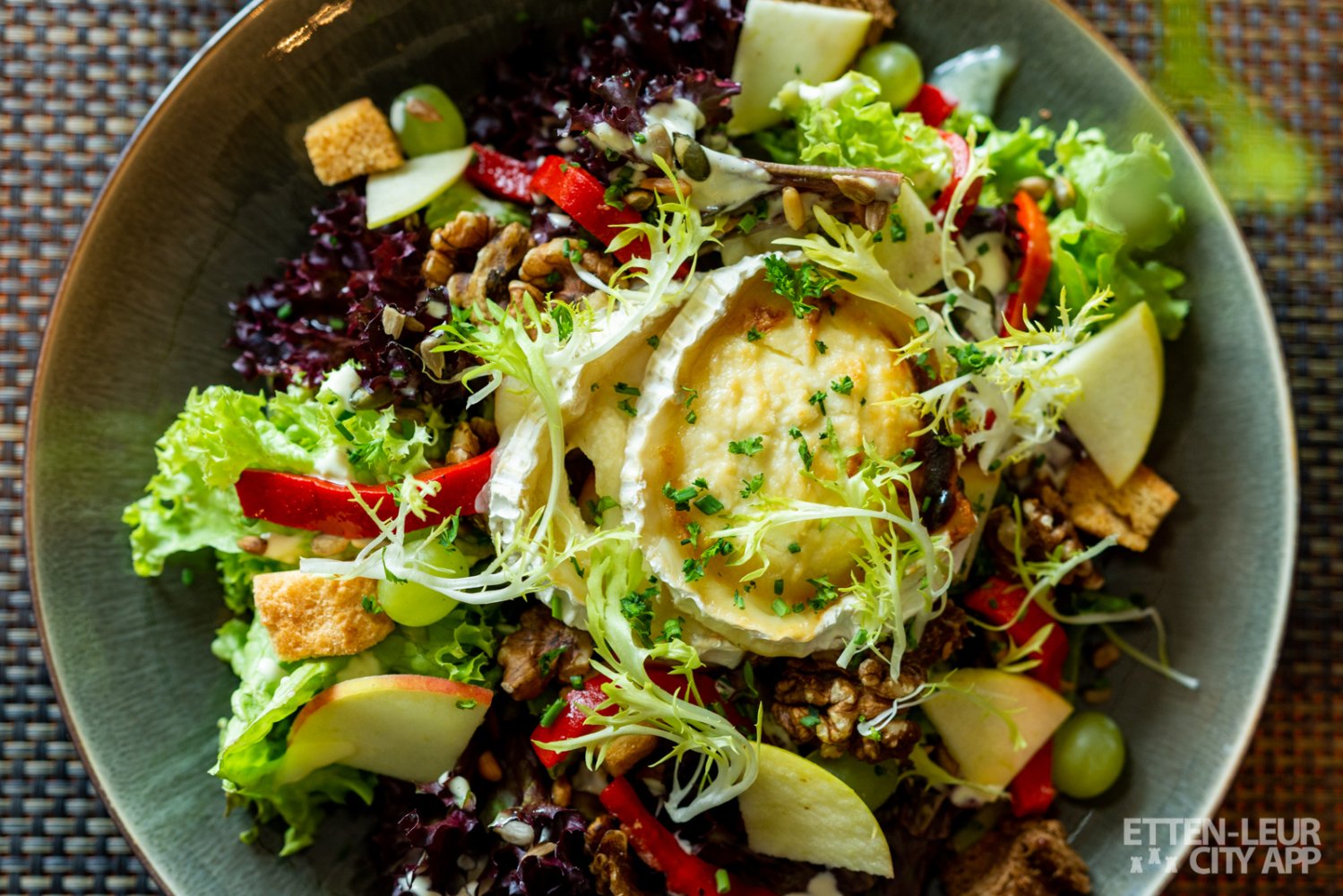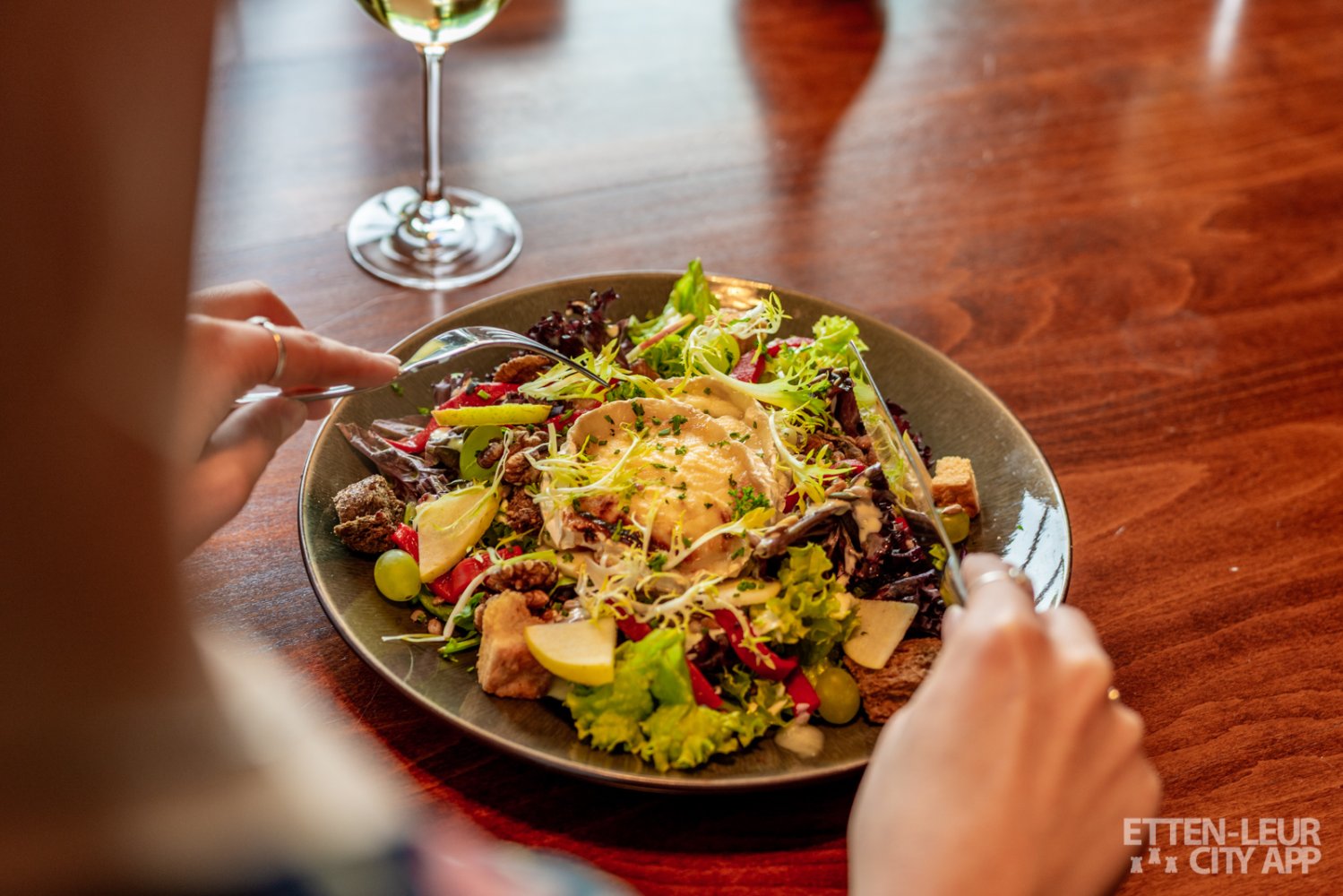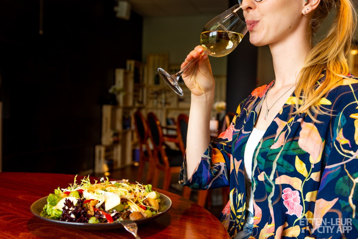 De Geitenkaas salade bestaat uit lollo verde, lollo rosso, gegrilde paprika, zaden, walnoten, warme geitenkaas, druiven, Elstar appel, knapperige croutons en een heerlijke frisse dressing. De porties zijn precies groot genoeg en de smaken zijn perfect in balans. Bij de lekkere lunch drinken we een jus d'orange, welke heerlijk vers is, en een Sauvignon Blanc, dit is een frisse toegankelijke wijn voor bij de heerlijke salade.