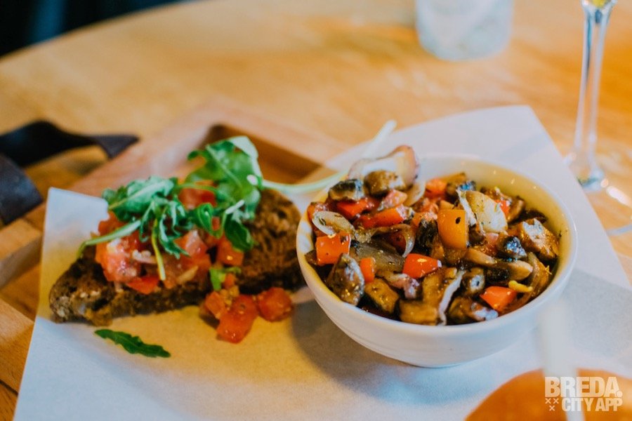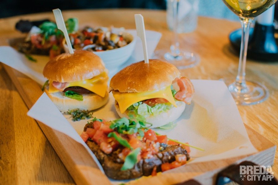 Tijdens het wachten op de tweede ronde bestellen wij een wit wijntje, die in mooie Smaak glazen wordt geserveerd. Deze ronde lunchgerechtjes bestaat uit een bruschetta gemaakt van bruin boerenbrood. Deze is goed op smaak gebracht met knoflook en kruiden. Een minihamburger met kaas en spek en een gerechtje met gebakken champignons, paprika, ui en tijm.