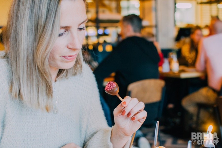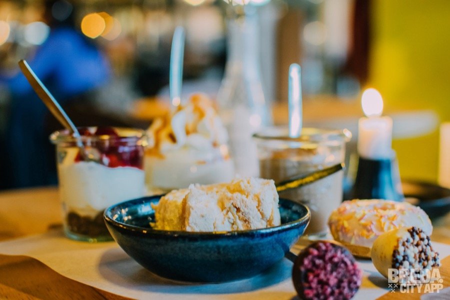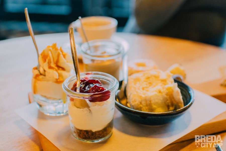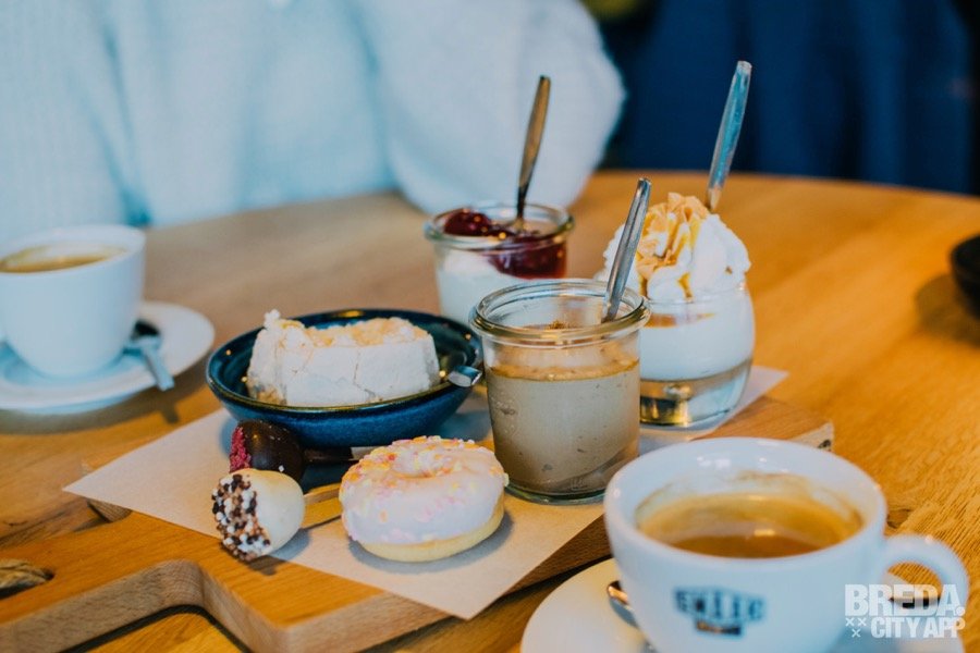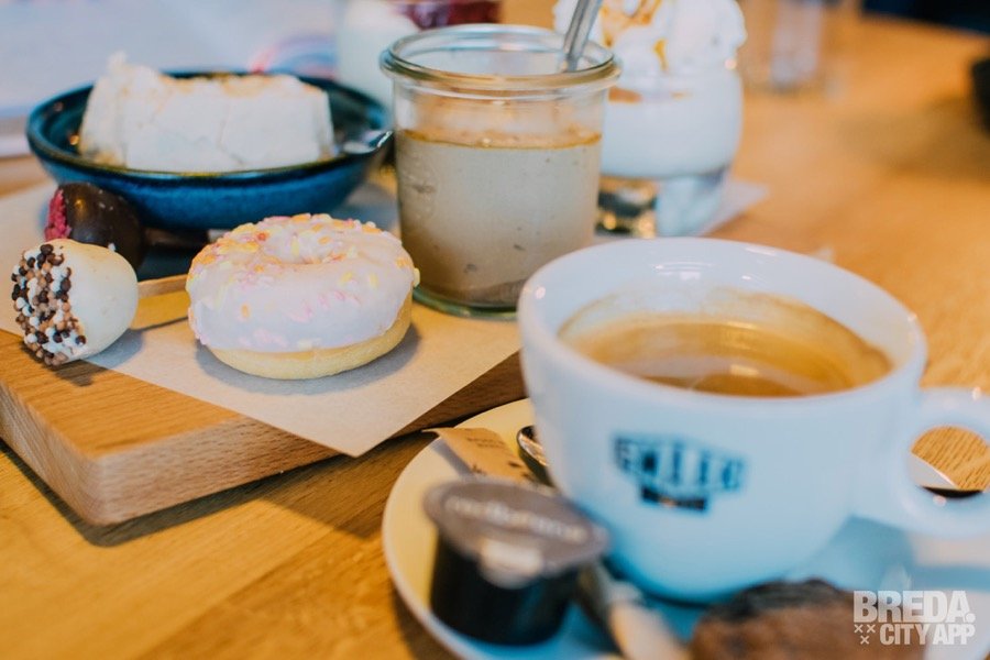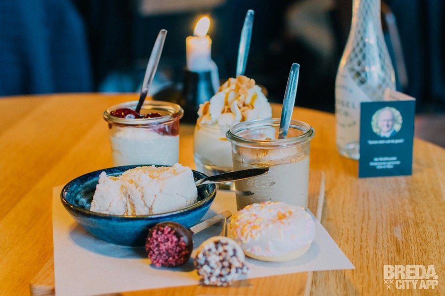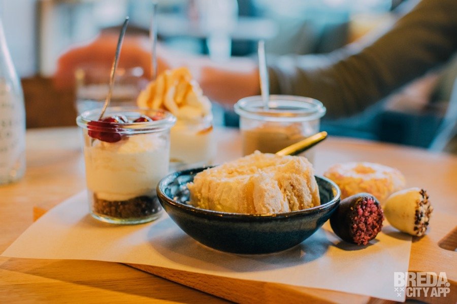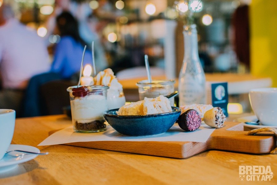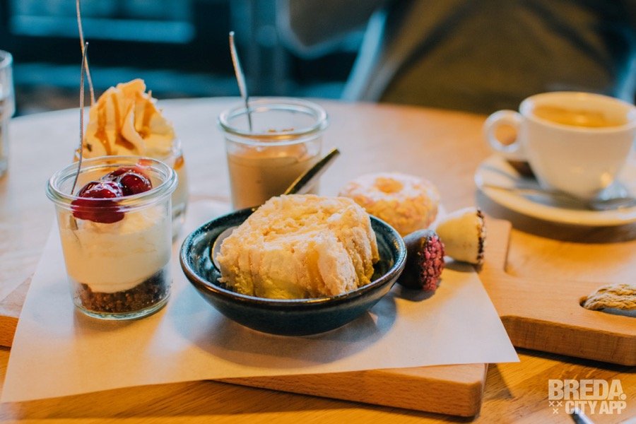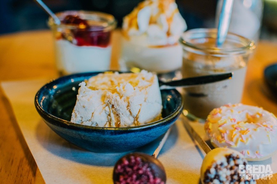 De kaart heeft naast de smaakbites ook losse lunchgerechten te bieden en verschillende mix & match planken van ontbijt tot en met vegetarisch. Er is ook een velerlei aan verschillende speciaal koffies en zoetigheden. Wij kiezen als afsluiting van de lunch voor een koffie en krijgen de laatste zoete ronde geserveerd. Deze bestaat uit een monchou toetje met een bastogne bodem, een chocomousse met karamel zeezout topping, bonbon lolly’s, een donut en een onverwacht maar lekkere karamelsmaak kwarktaart. De topper van deze plank is de smeuïge meringue citroen schuimtaart. Heerlijk!