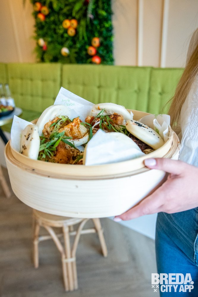 De Bao Bun Box komt op tafel! Dit ziet er indrukwekkend uit, vijf verschillende Buns om te delen. De vijf Buns zijn gevuld met Gyoza, Buikspek, Tempura Garnaal, Pulled Beef, en Tempura Chicken. Verder is de Bao Bun gevuld met: witte kool, gefrituurde rode ui, sriracha mayonaise, lente ui en sesam. Ze zijn stuk voor stuk hartstikke lekker en ook gezond!