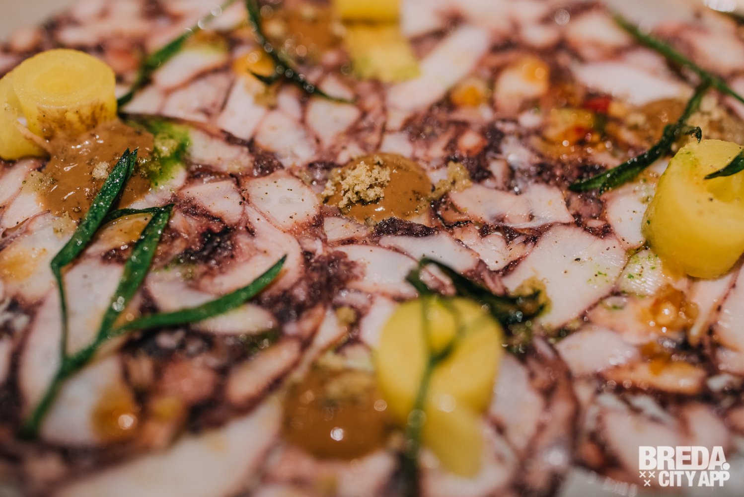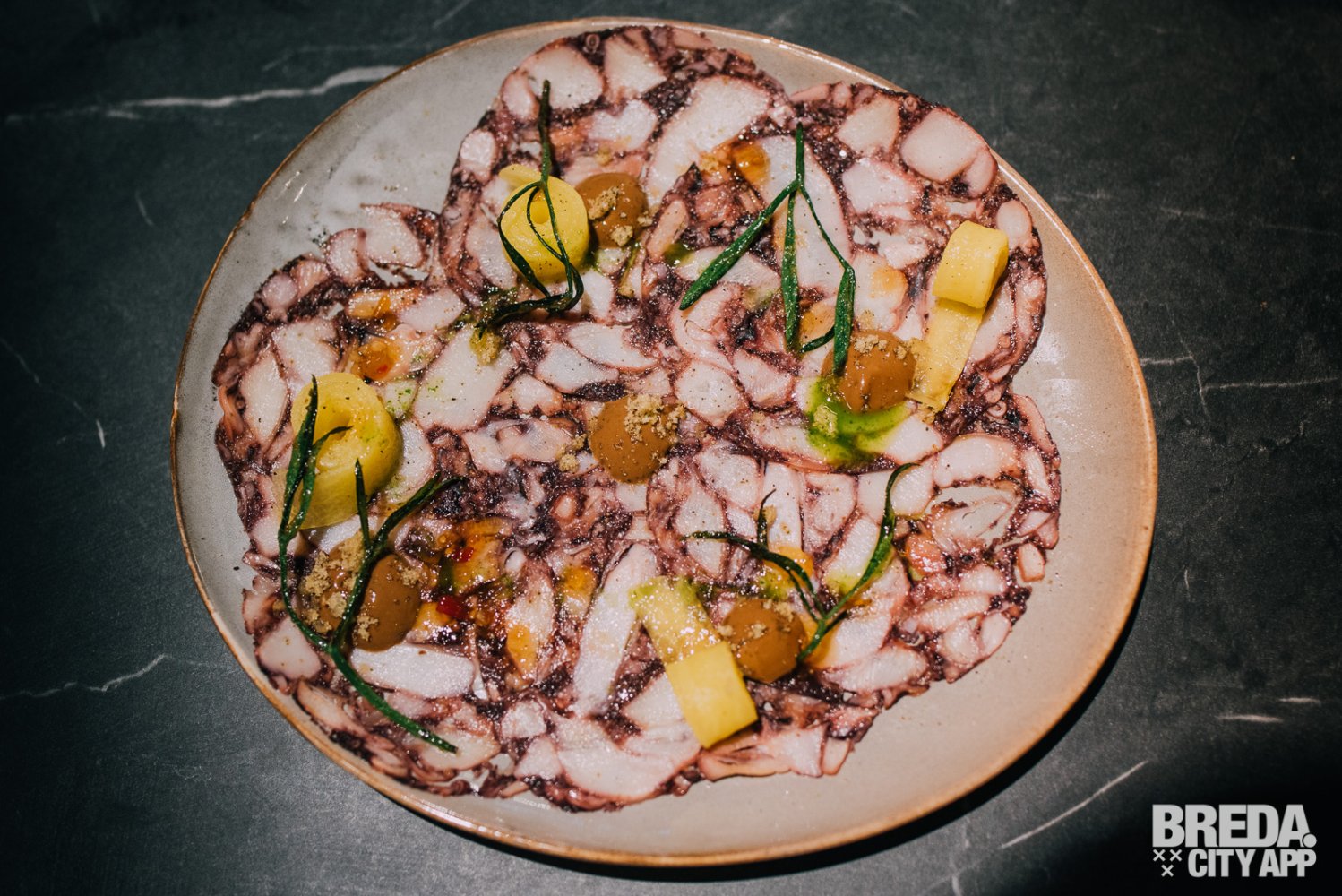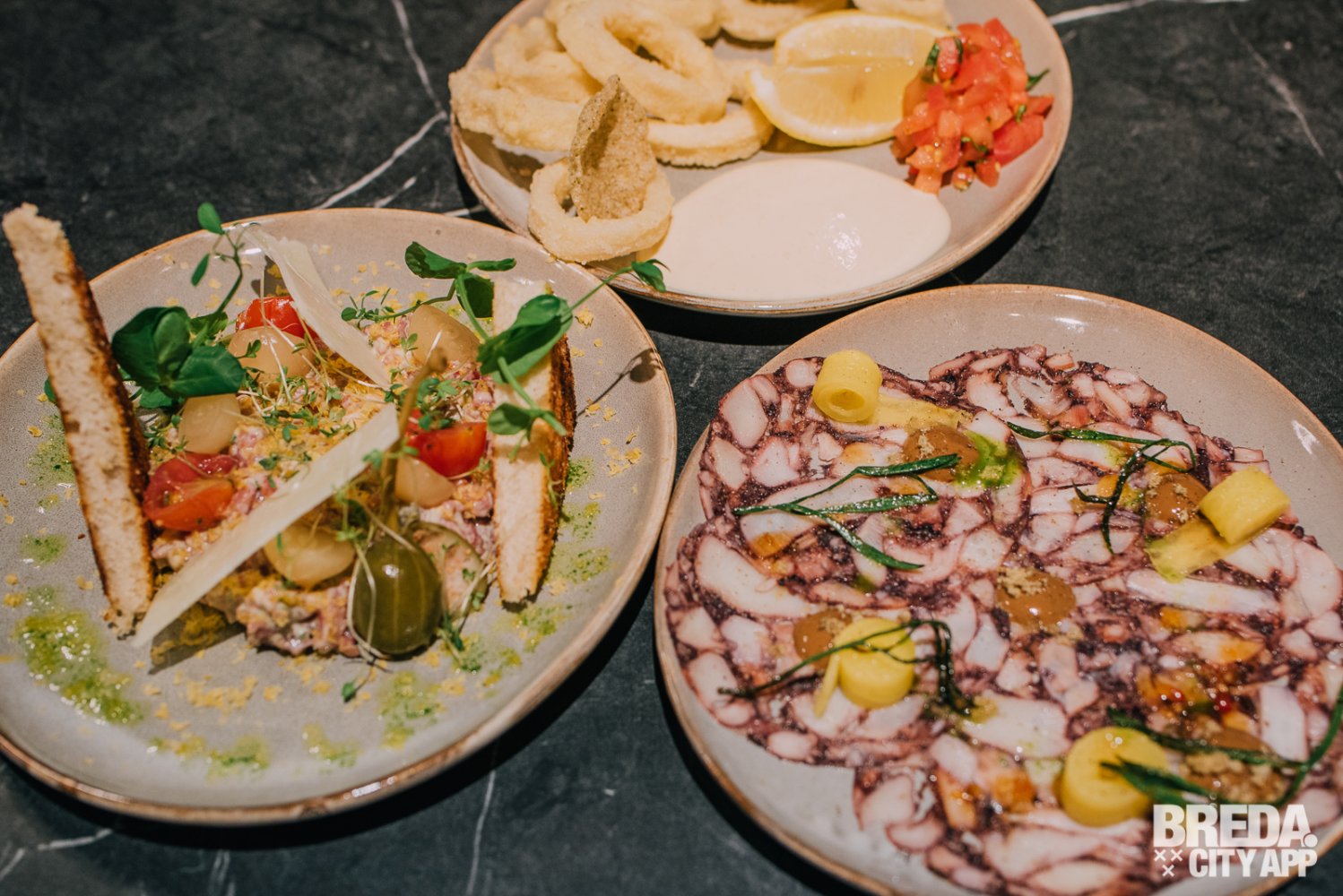Als de mooi opgemaakte borden voor onze neus worden gezet is direct duidelijk dat de klassieke gerechten in een fris en modern jasje gestoken zijn. Ook de smaken zijn fris en verrassend. De inktvisringen zijn knapperig en in combinatie met de citrus aioli een perfect voorgerecht. De paarse kleur van flinterdun gesneden octopus carpaccio knalt van het bord en verraad al een beetje de volle smaak die het, samen met de zwarte knoflook en chili jam heeft.