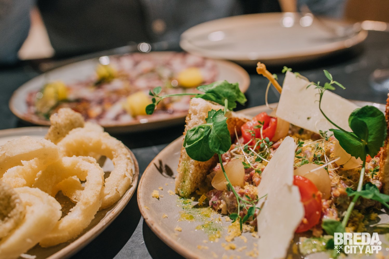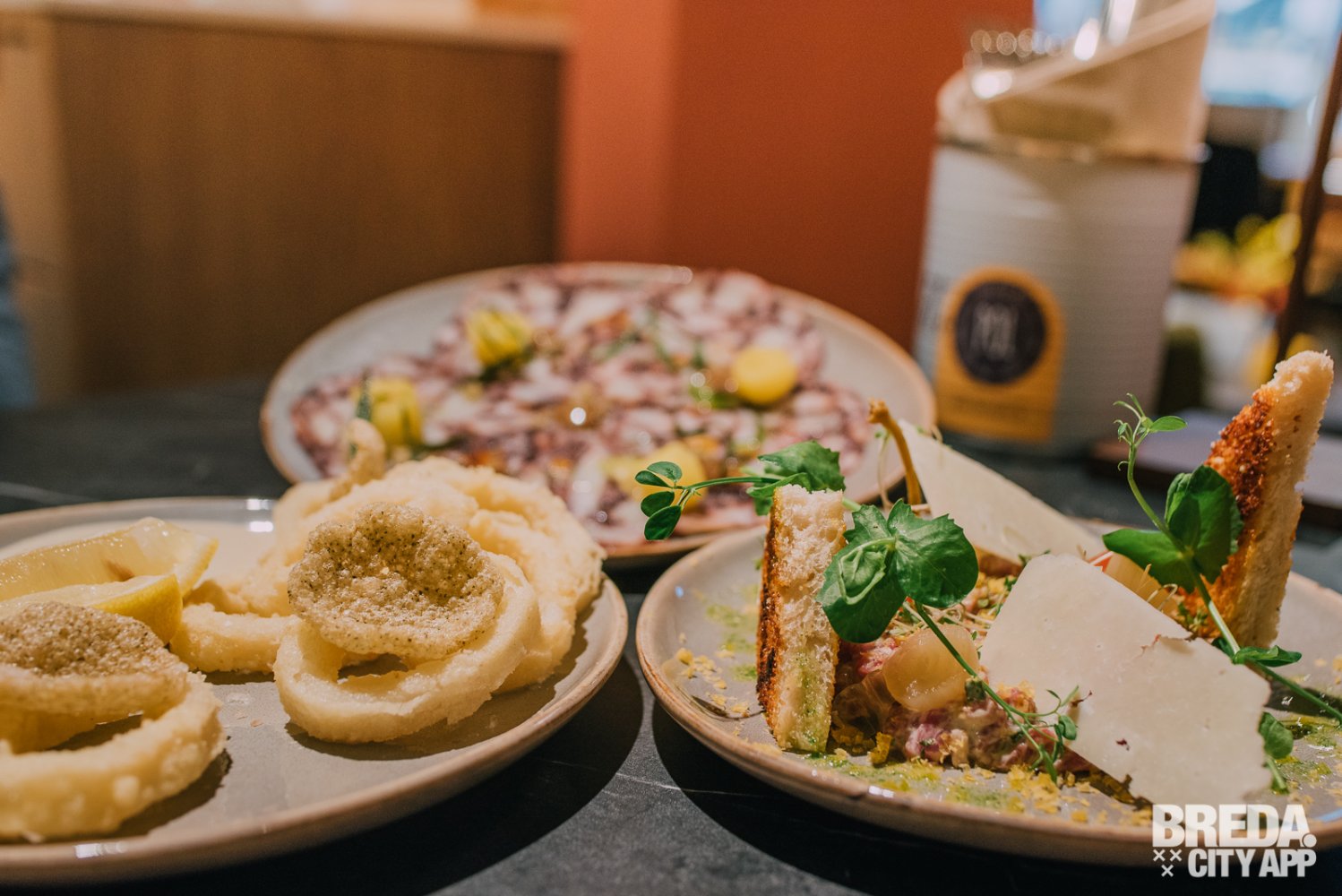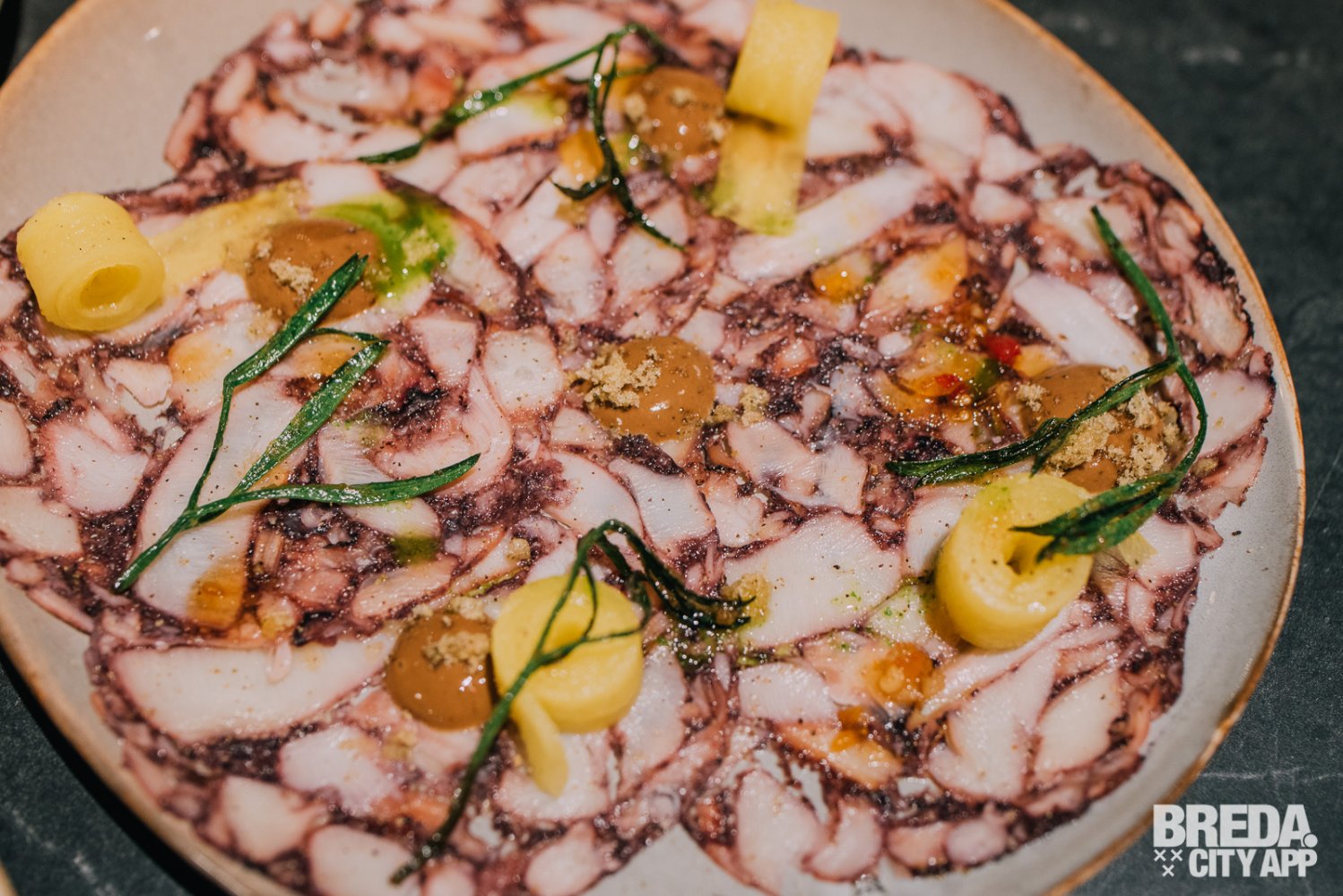 Als de mooi opgemaakte borden voor onze neus worden gezet is direct duidelijk dat de klassieke gerechten in een fris en modern jasje gestoken zijn. Ook de smaken zijn fris en verrassend. De inktvisringen zijn knapperig en in combinatie met de citrus aioli een perfect voorgerecht. De paarse kleur van flinterdun gesneden octopus carpaccio knalt van het bord en verraad al een beetje de volle smaak die het, samen met de zwarte knoflook en chili jam heeft.