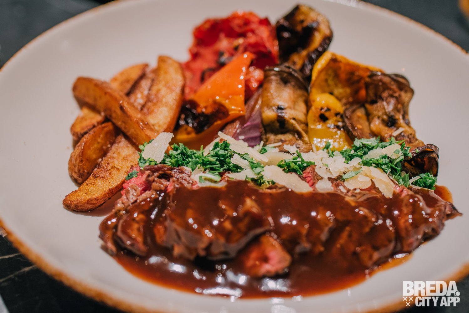 Naast de pizza krijgen we de tagliata geserveerd. Een mooie bavette die smelt op de tong. Het is duidelijk een heel goed stuk vlees dat wederom met veel liefde is klaargemaakt en zonder al te veel poespas helemaal tot zijn recht komt, want poespas heeft zo’n goed stuk vlees helemaal niet nodig. Opvallend is dat de passie en aandacht voor het product zelfs naar voren komt in de gegrilde tomaat, paprika en aubergine die de bavette vergezellen. Het wordt ons steeds duidelijker met hoeveel plezier en vakmanschap er hier in de keuken wordt gewerkt.