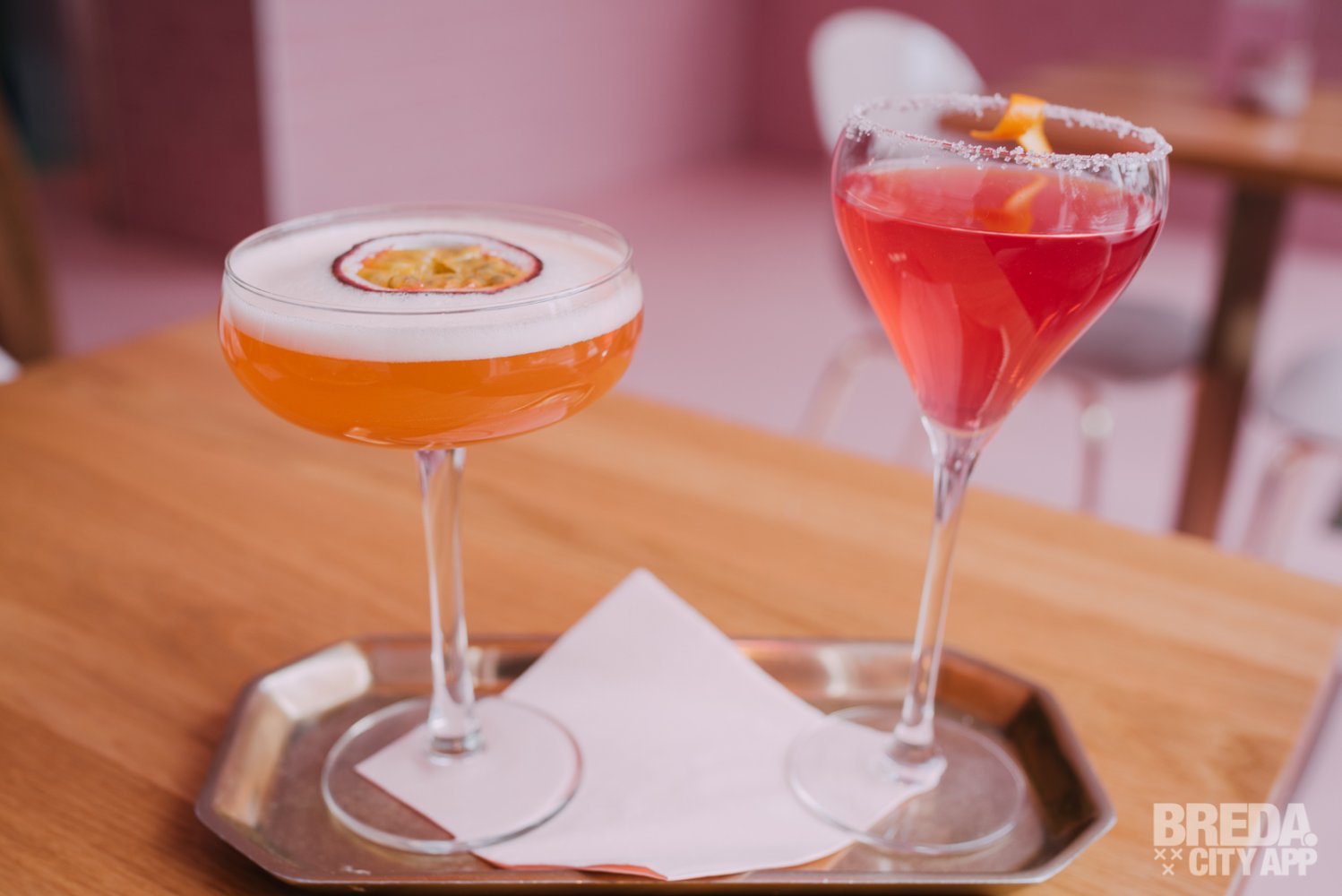 Daarna krijgen we de keuze uit twee andere cocktails van de kaart. De cocktails die ze hebben zijn: Cosmopolitan, Amaretto Sour, Pornstar Martini, Gin Tonic en een Cotton Candy Mocktail (zonder alcohol). Je mag gedurende de High Cocktail zelf dus nog 2 cocktails uitkiezen per persoon. Wil je er meer dan 2? Dan kun je die er uiteraard gewoon nog bij bestellen. Wij hebben als eerst gekozen voor de Pornstar Martini en de Cosmopolitan. Wat een prachtige kleuren!