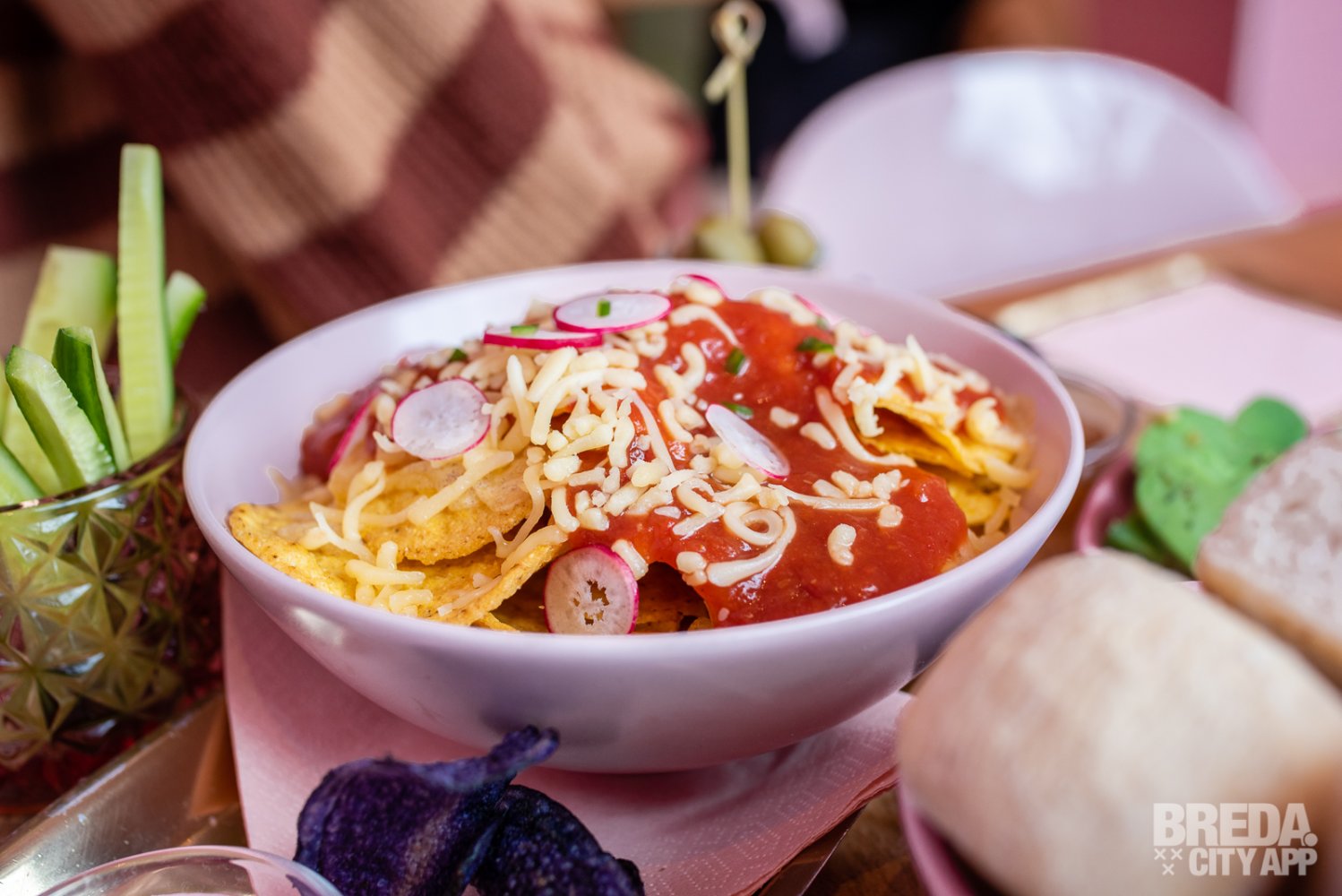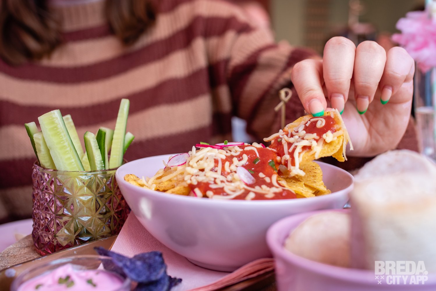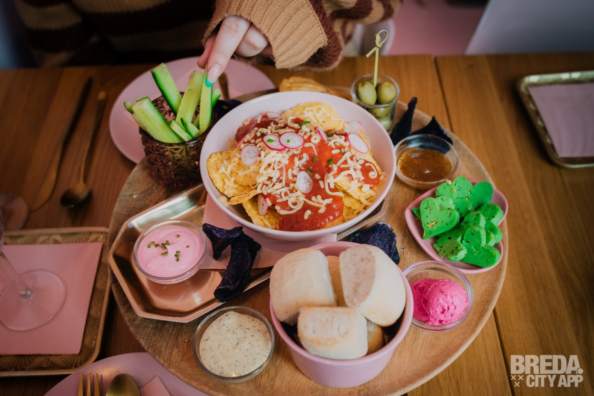 Samen met de eerste cocktail krijgen we een hartige borrelplank voorgeschoteld. Deze bestond uit lekkere nacho chips met salsa en kaas, broodjes met verschillende dipjes, komkommertjes, kaasjes, hartige madeleines en nog meer. Het was niet alleen lekker maar ook supermooi opgemaakt.