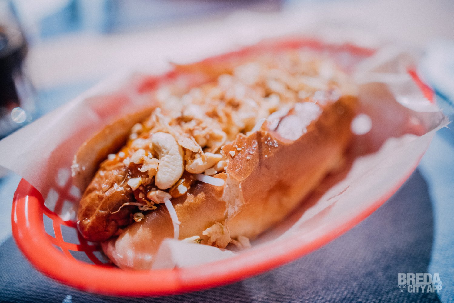 Wij bestellen nog een drankje en beginnen aan de Asian hotdog. Deze hotdog is rijkelijk gevuld met gebakken uitjes, taugé, cashewnoten en grilled sweet pepper. In combinatie met het vlees is ook deze hotdog een aangename verrassing! Heerlijk.