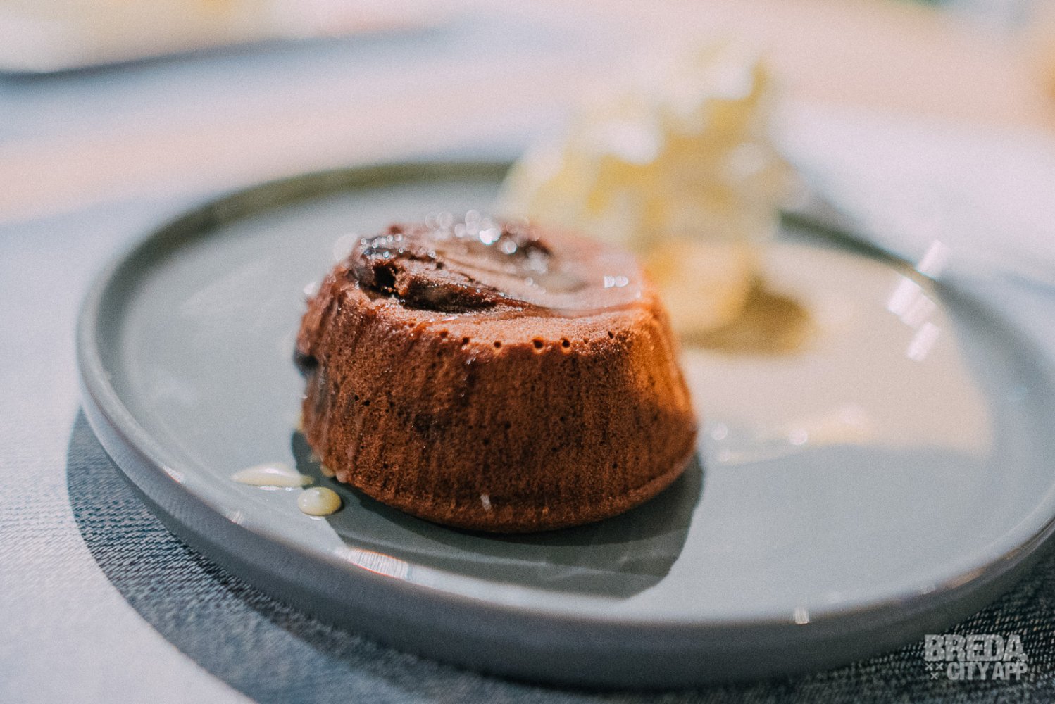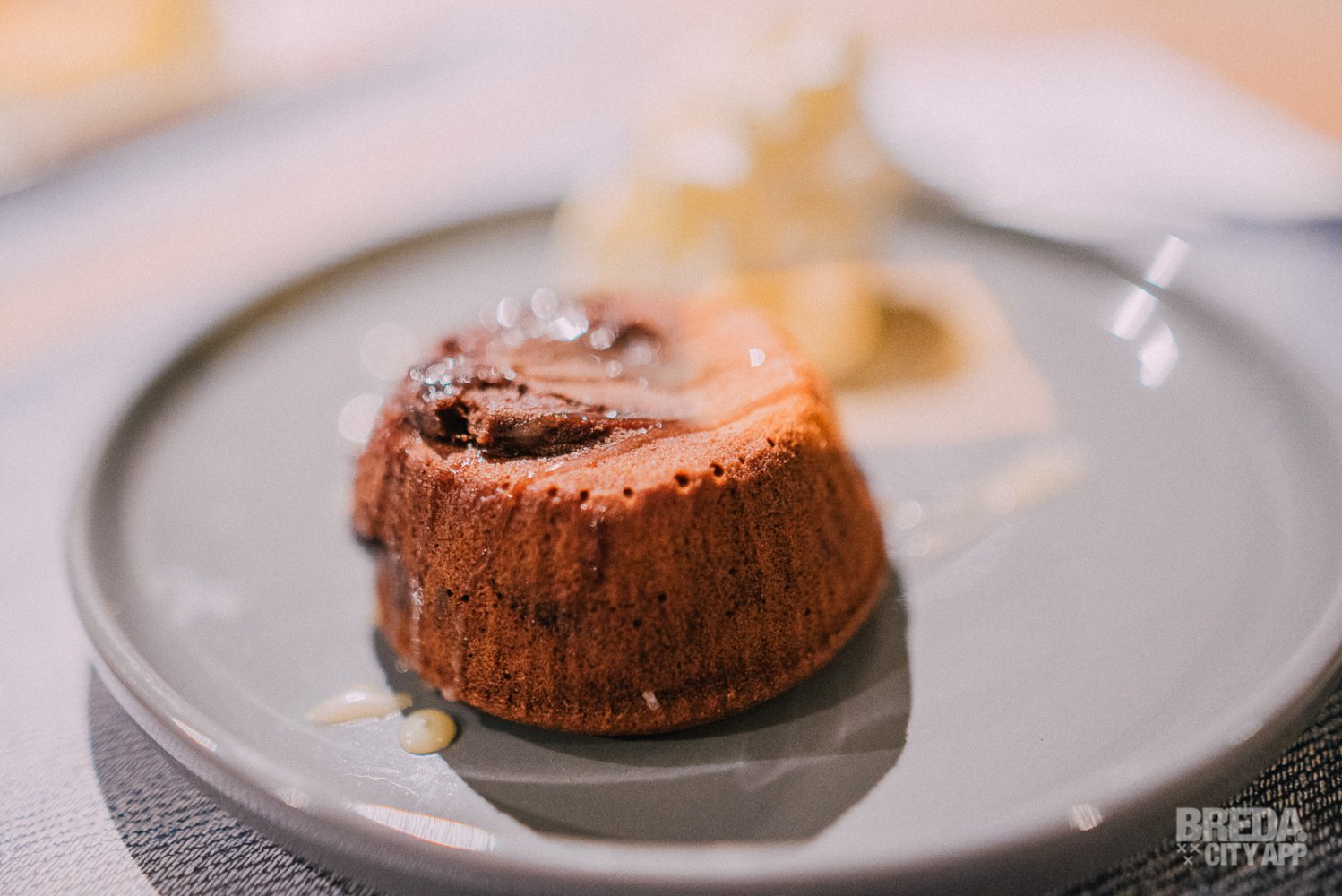Na al dit lekkers hebben we gelukkig nog een klein plekje over voor een dessert. Ons oog valt op de chocoladesoufflé en semifreddo mango. De chocoladesoufflé is de hemel voor de echte chocolovers onder ons! Er wordt een heerlijke chocoladesoufflé geserveerd met een toef slagroom. Wanneer wij de soufflé aansnijden vloeit de heerlijke chocoladesaus uit het hart van het dessert.