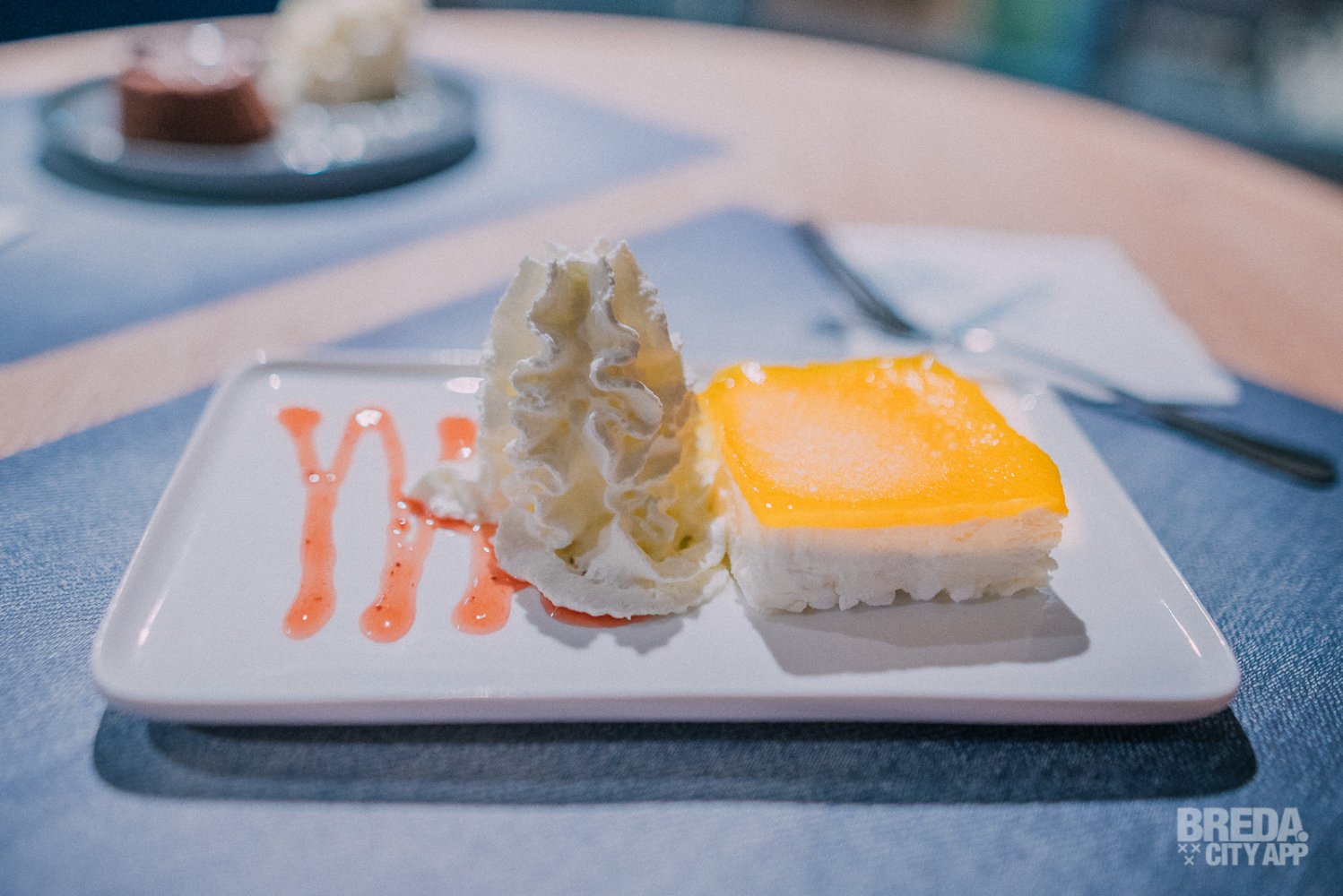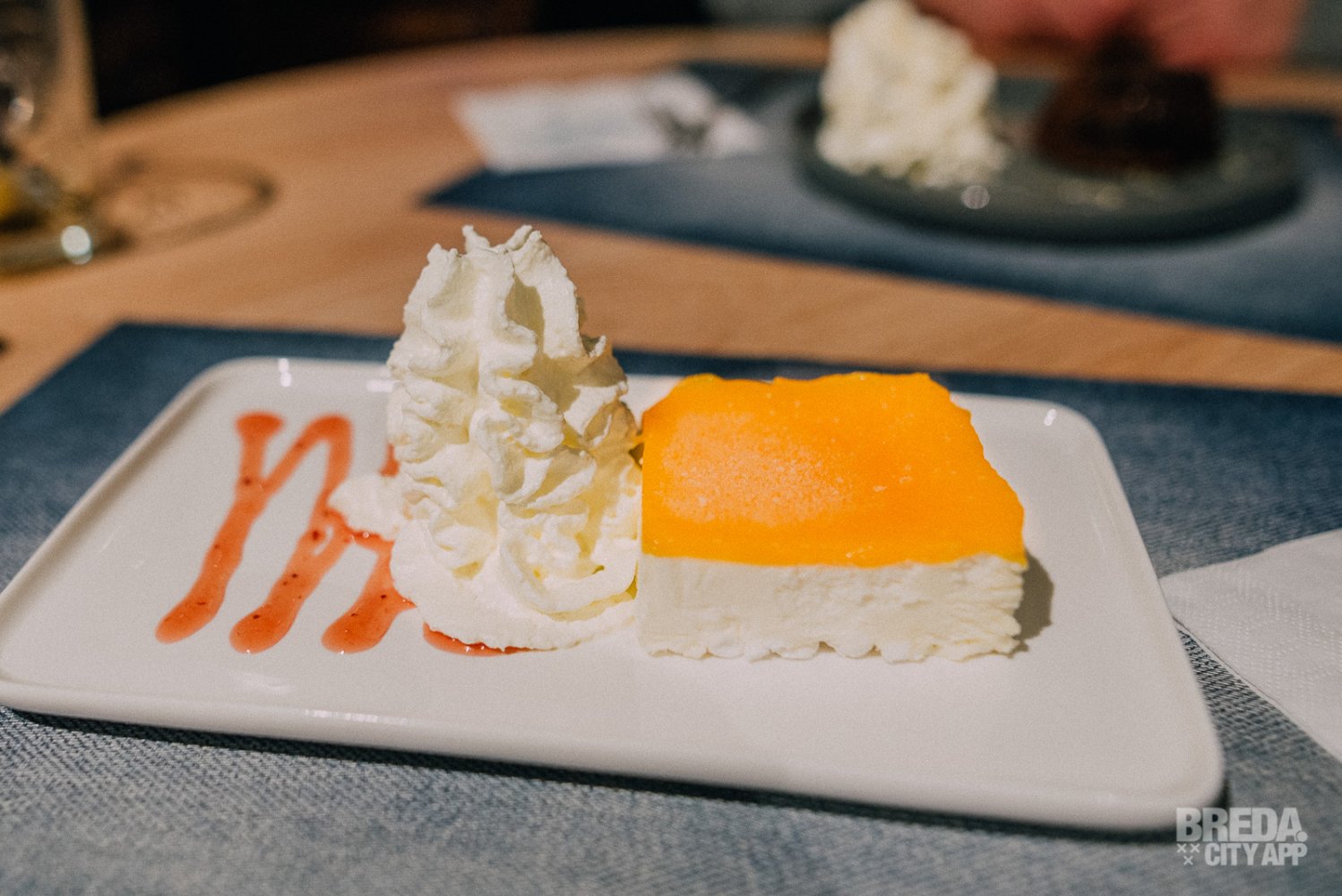 Dit dessert is een absolute aanrader! De semifreddo heeft een bodem van meringue en een frisse gelei van mango on top. Ook dit dessert wordt geserveerd met een flinke toef verse slagroom.
