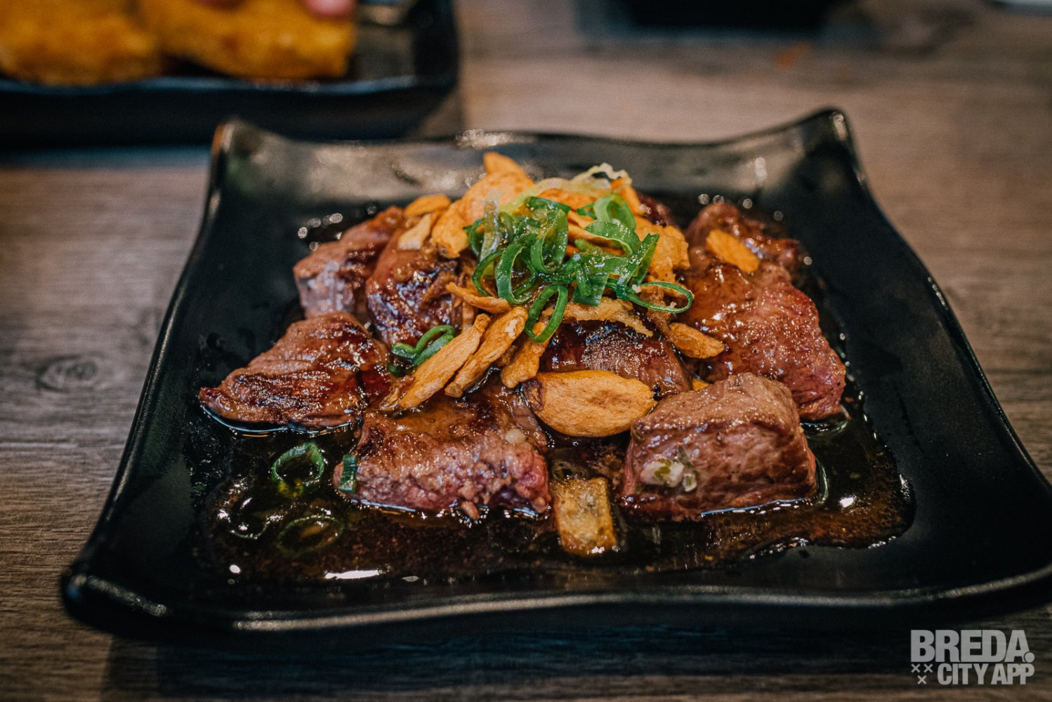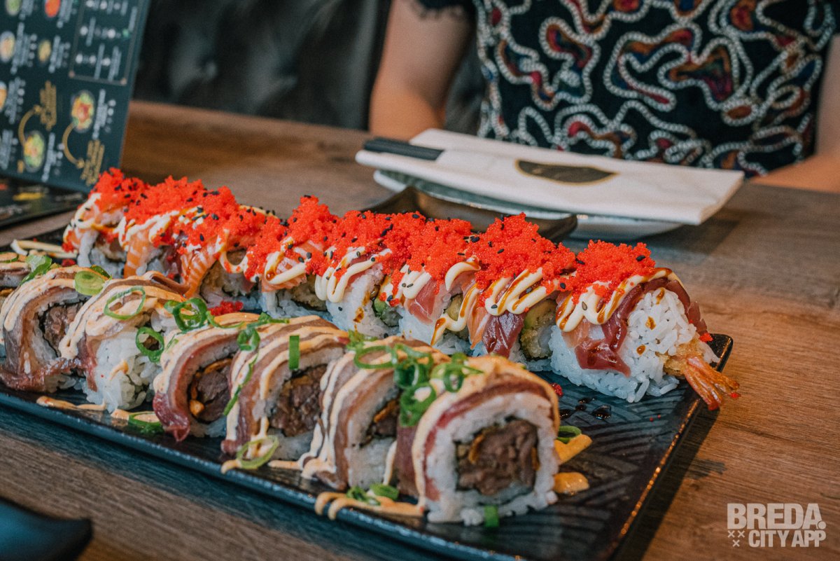 Het eerste wat we bestellen via onze telefoons met de QR-code, zijn twee verschillende sushi rolls van de deluxe hapjes: de spicy beef maki en de dragon maki. De sushi rolls zijn mooi en vrolijk opgemaakt, echt een feestje op het bord. De spicy beef maki is lichtpittig, gevuld met heerlijk mals vlees en heeft een lekkere teriyaki saus. De dragon maki is gevuld met een gefrituurde garnaal en heeft zalm bovenop liggen, wat zich uit in heerlijke frisse vis sushi. En dit is nog maar het begin van de avond.