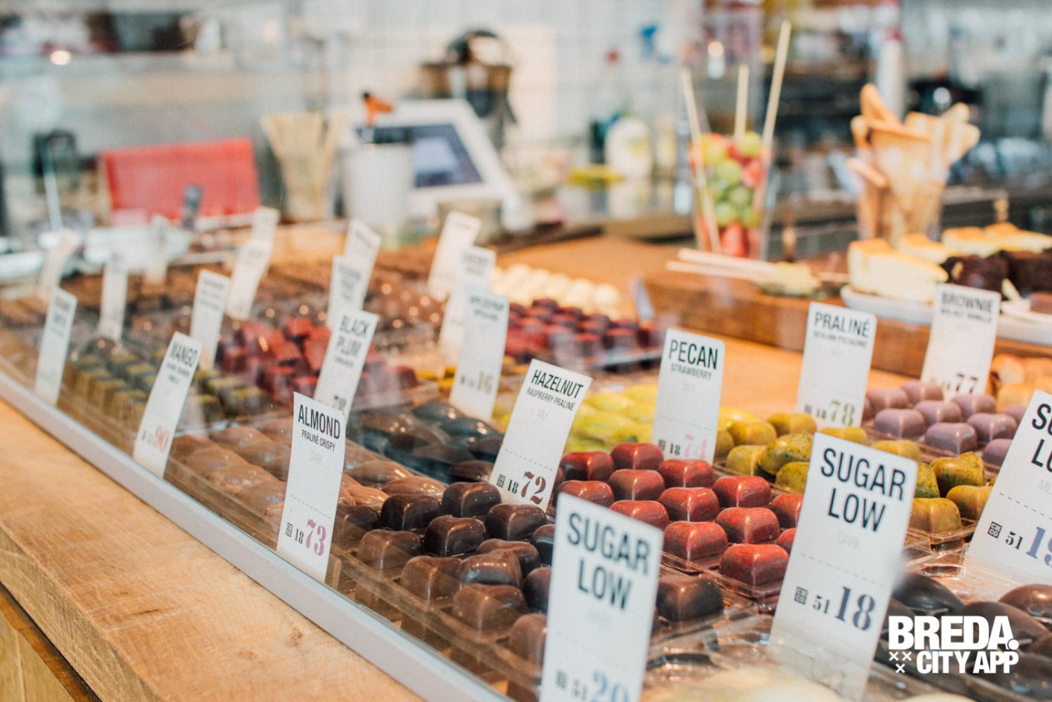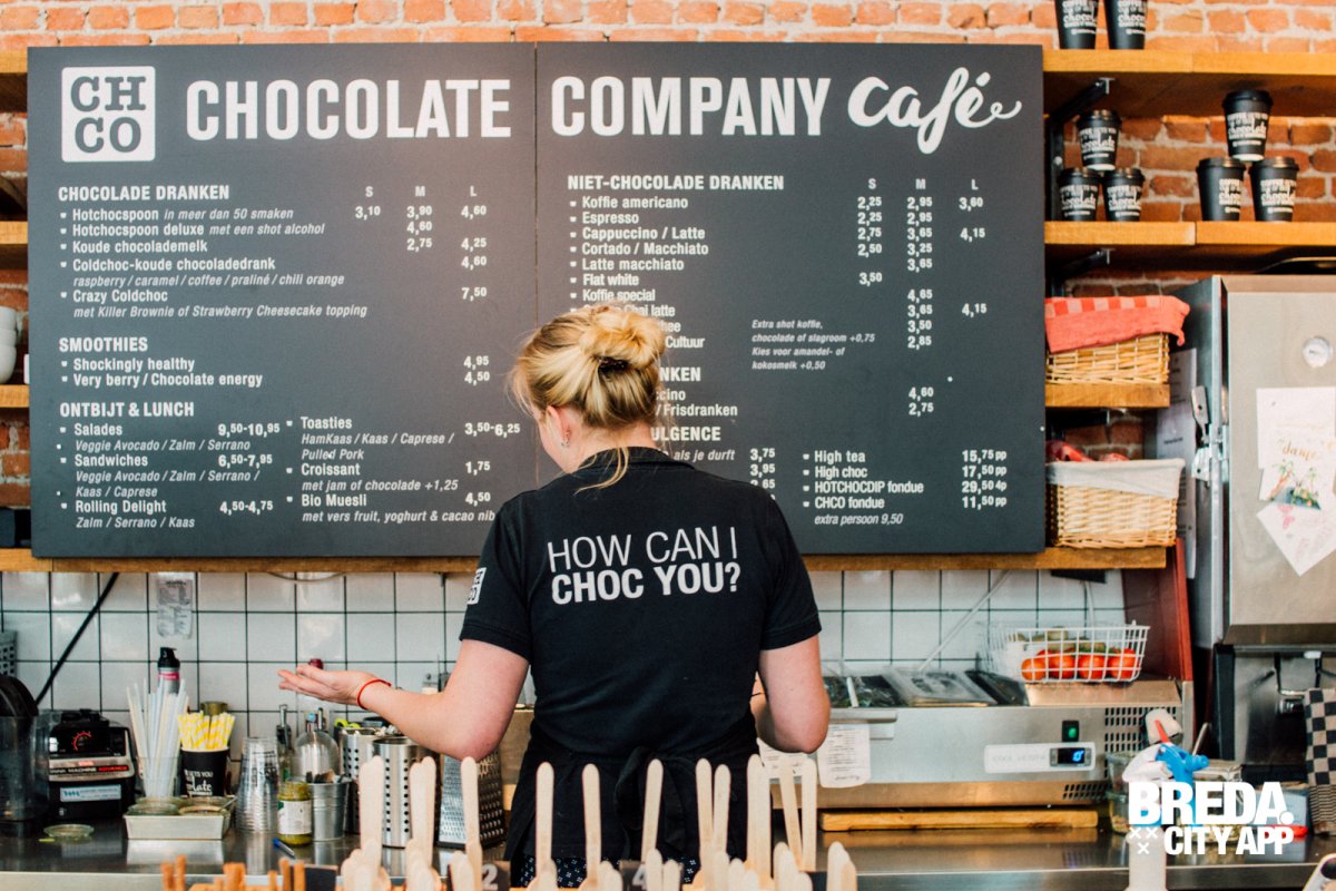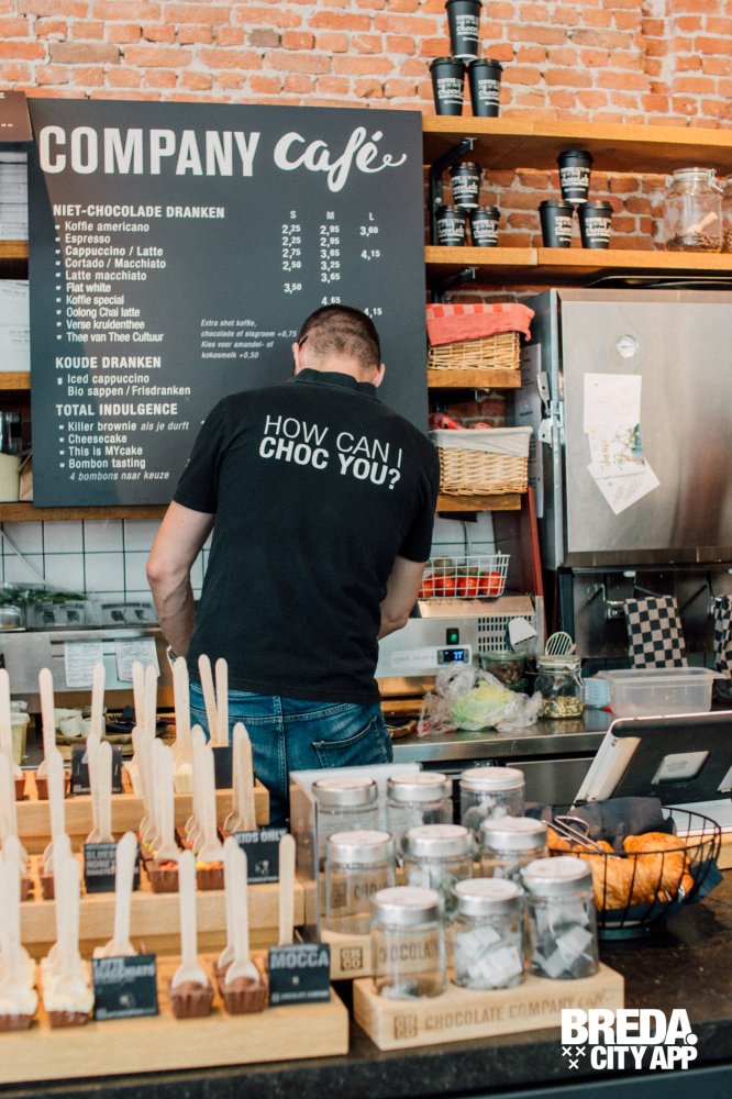 Dennis - de chocleader - verwelkomt ons en begint vol passie te vertellen over zijn concept. Chocolate Company Café is een combinatie van winkel én horeca. Zomaar binnenstappen om je favoriete chocolade product of ambachtelijk bonbons te kopen. Dat kan hier! Zoek een plekje in het café en geniet van een krantje en goede koffie. Of pak op het terras - gelegen aan het levendige Van Coothplein – een verwenmomentje voor jezelf met een overheerlijk chocoladetaartje (bijvoorbeeld de killer brownie cake…mmm!). Het mag hier allemaal.