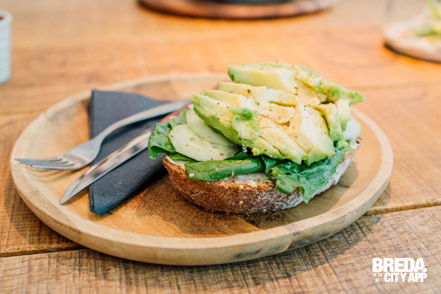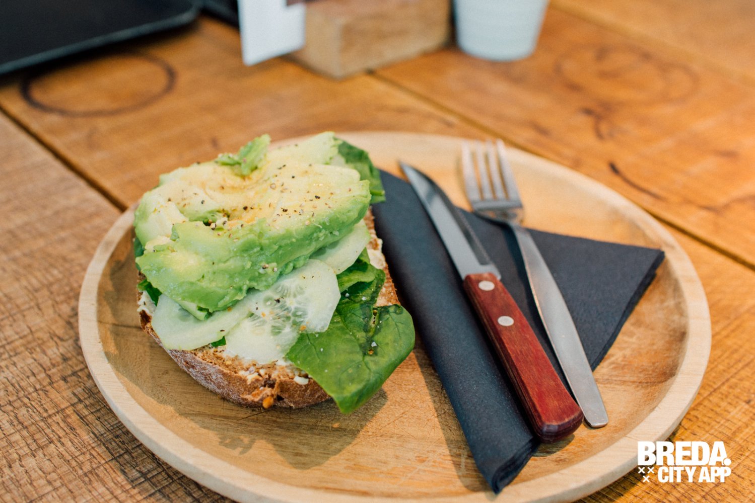 Dan de gerechten. Hummus en avocado, altijd een heerlijke combinatie! Dus wij bestellen de Sandwich Hummus & Avocado, een sandwich van huisgemaakt vloerbrood met verse kikkererwtenhummus, avocado, bladspinazie en komkommer. Een zeer smaakvol broodje, vinden wij.