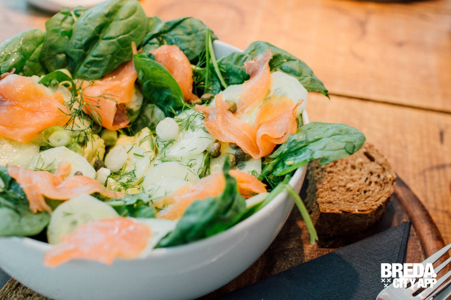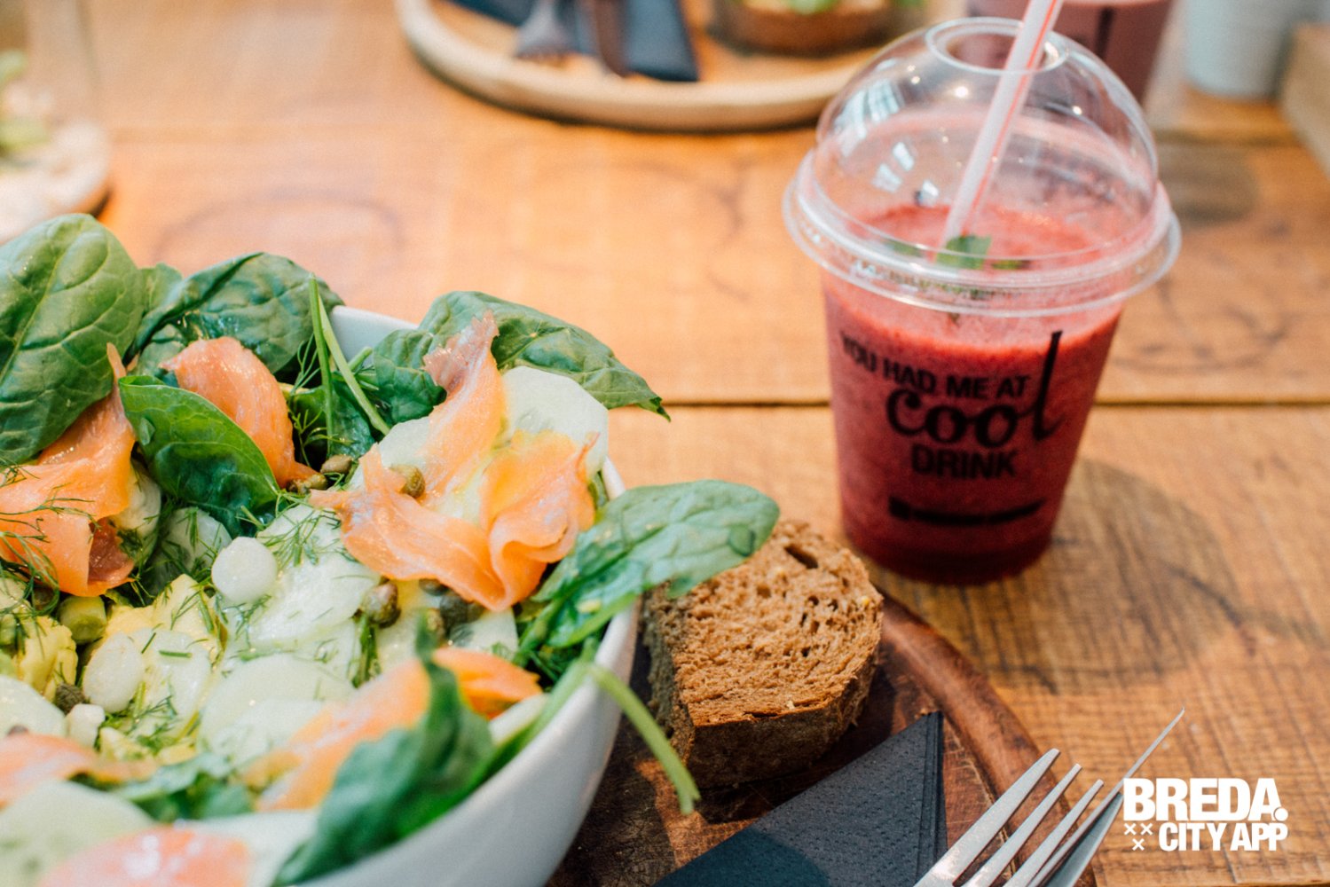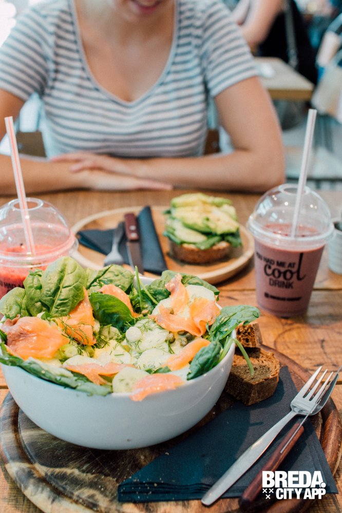 Ook bestelden wij de salade “Gerookte zalm & Avocado”; een salade van - je raad het al - gerookte zalm en avocado. In combinatie met jonge bladspinazie, komkommer, kappertjes en een vinaigrette van dille & citroen is dit een heerlijke salade. Samengesteld van verse ingrediënten en dat proef je!