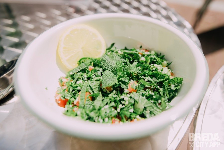Ook krijgen we nog vers gemaakte hummus. Deze hummus is gemaakt van kikkererwtenpuree, sesamzaad en citroen. Ook bij de hummus merk je duidelijk dat alles vers bereid is, zeker in combinatie met de falafel is deze heerlijk. Daarnaast voor de verfrissing nog een salade, de Tabouleh. Deze salade is gemaakt van peterselie, tomaten, komkommer, uien en bulgur. De citroen die erbij geserveerd wordt zorgt voor een heerlijk frisse smaak.