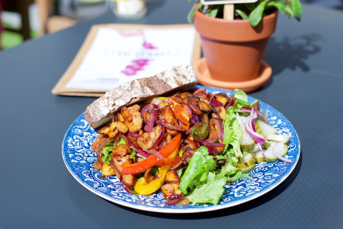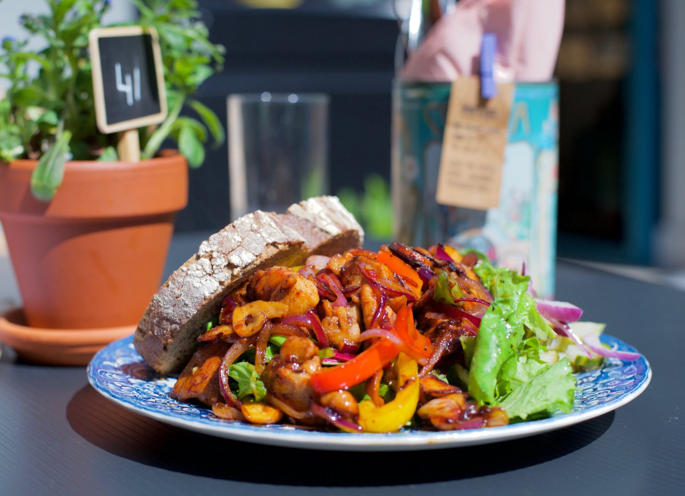 Op het terras wordt je al snel begroet door een van de lieftallige medewerkers en wordt je op je wenken bediend. De bediening bestaat gedeeltelijk uit jongeren met een verstandelijke beperking die nauw samenwerken met de rest van de gastheren-en dames. Ik koos voor de sandwich pikante kip. Bij de sandwich kon ik kiezen tussen wit-of bruin brood en het gerecht werd snel geserveerd. Het was op zijn minst een volledig gerecht te noemen, bij Jan en Alleman krijg je absoluut waar voor je geld. De sandwich komt op twee dik gesneden stukken vers brood die rijkelijk belegd zijn met malse kipfilet, paprika, rode ui, gemengde salade en champignons.