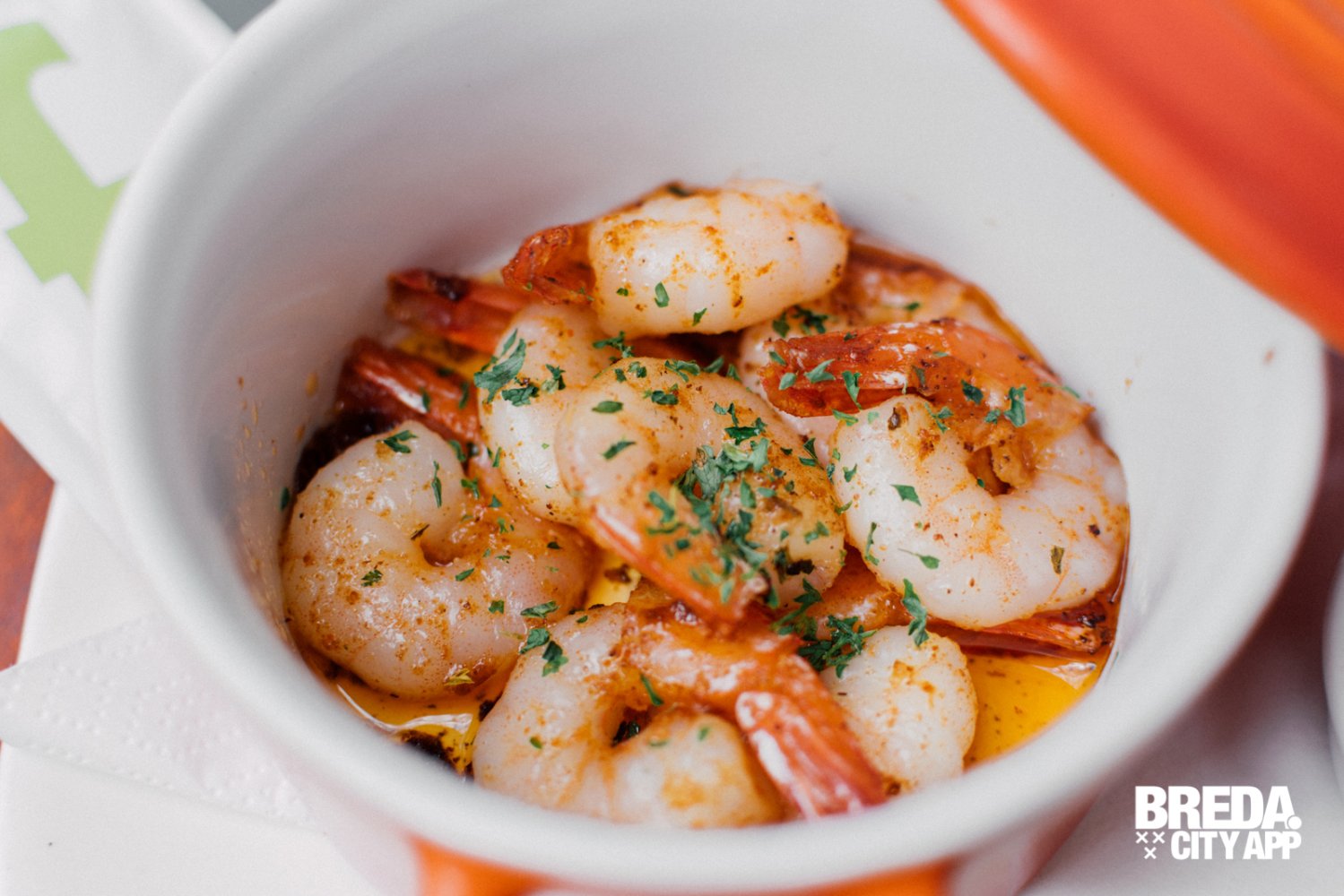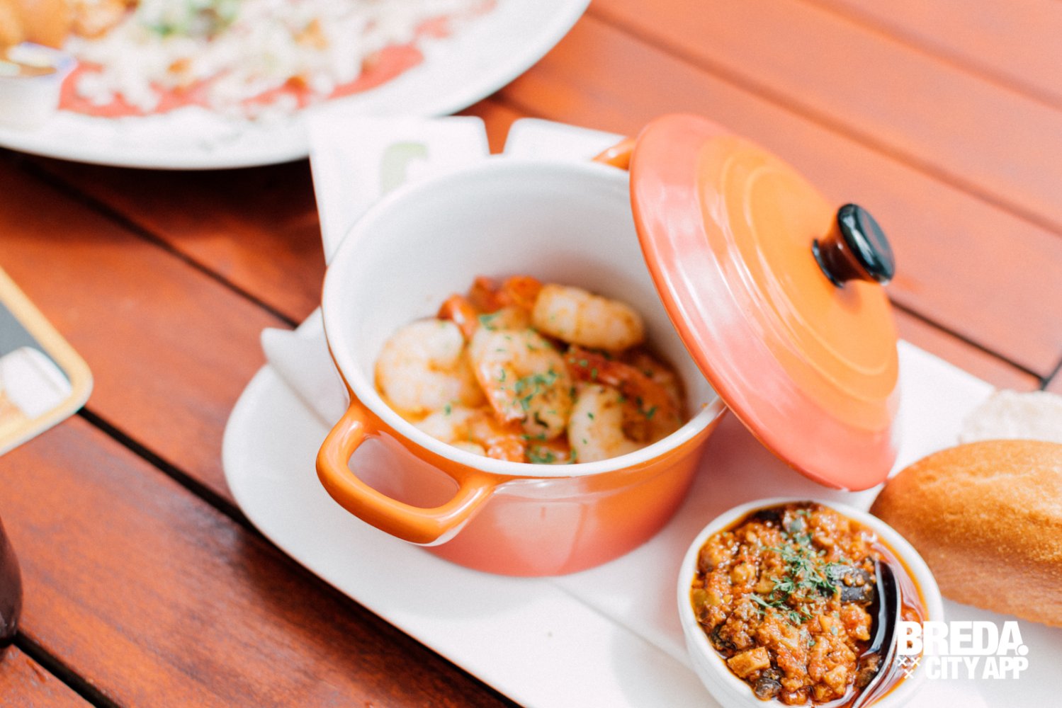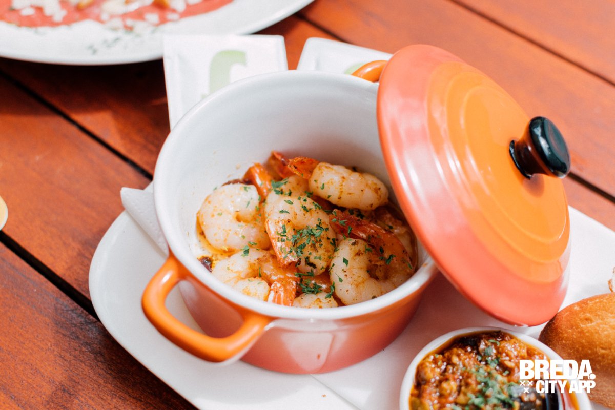Het tweede gerecht is een pannetje gamba’s in chili knoflookolie en olijventapenade. De gamba’s hebben een mooie bite en ze zijn ook echt lekker pittig zoals beloofd. Dus een biertje is dan ook zeker op zijn plaats.