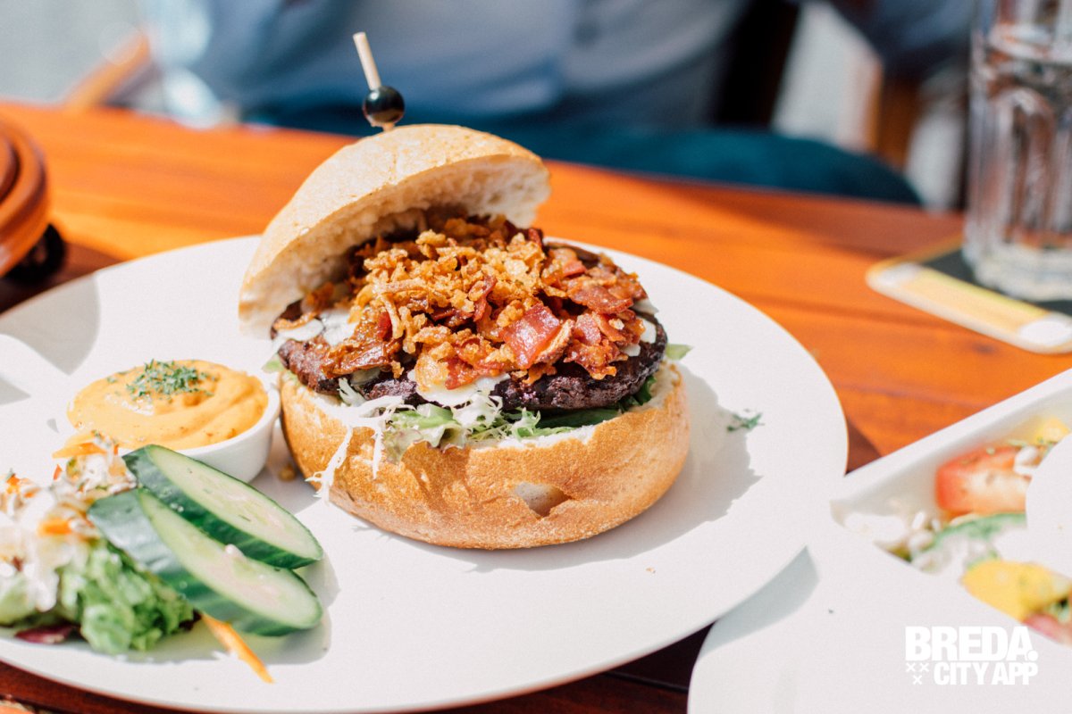 Ook hebben we gekozen voor de hamburger Dependance. Op een knapperig broodje met Parmezaanse kaas, zongedroogde tomaat, sla, krokant gebakken uitjes en bacon. Hiernaast een mooi aangemaakt kruiden mayonaise. Lekker met krokante frietjes en een salade.