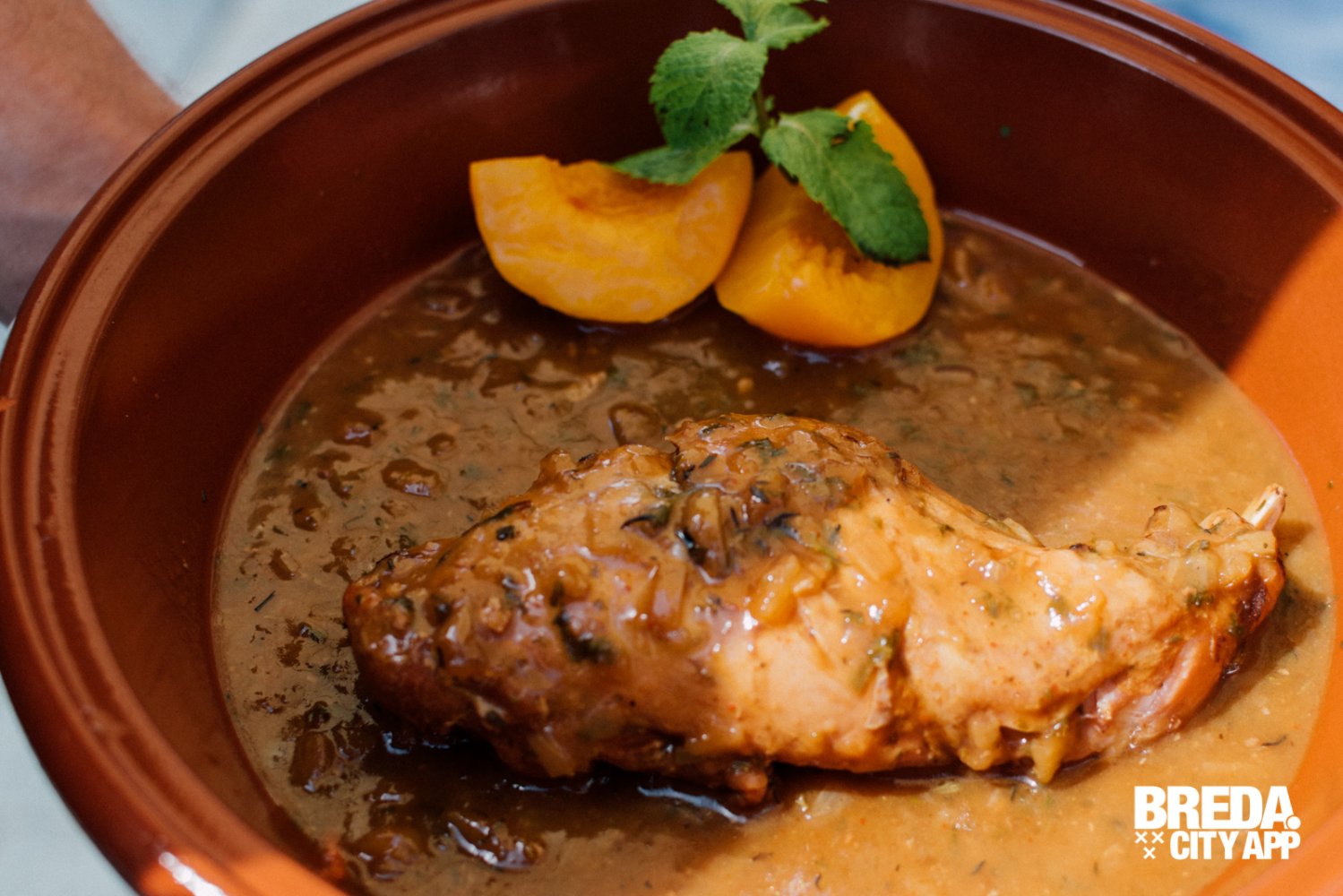 De laatste gang bestaat uit gestoofde konijnenbout met perzik in een tajine saus geserveerd. De saus is zoet-pittig met een vleugje oosters. Wij menen komijn te proeven. Aangezien wij erg nieuwsgierig waren naar dit gerecht waren we ook blij verrast. Zowel presentatie als malsheid van het vlees.