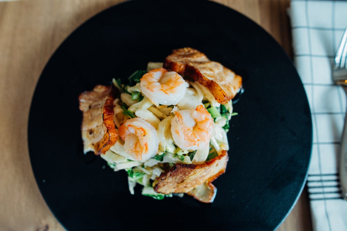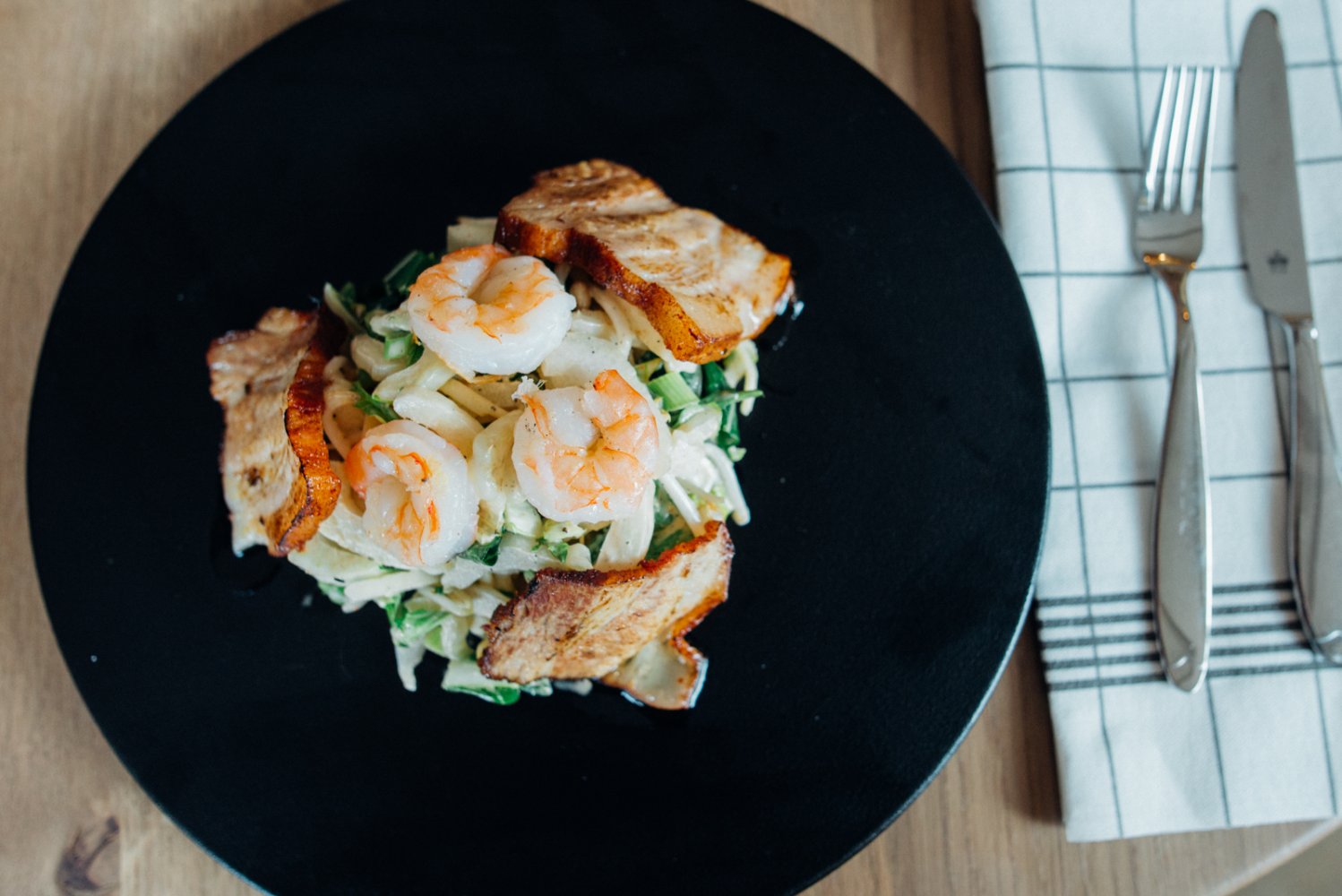 Tijdens deze lunch koos ik voor de Salade Surf & Turf. Deze verrukkelijke salade in Oosterse stijl was heerlijk fris. De combinatie van de malse gebakken scampi's en langzaam gegaarde buikspek voldeed aan al mijn hoge verwachtingen. De salade was een goede combinatie van noodlesalade, paksoi, taugé en bosui en bovendien nog eens prachtig gepresenteerd!