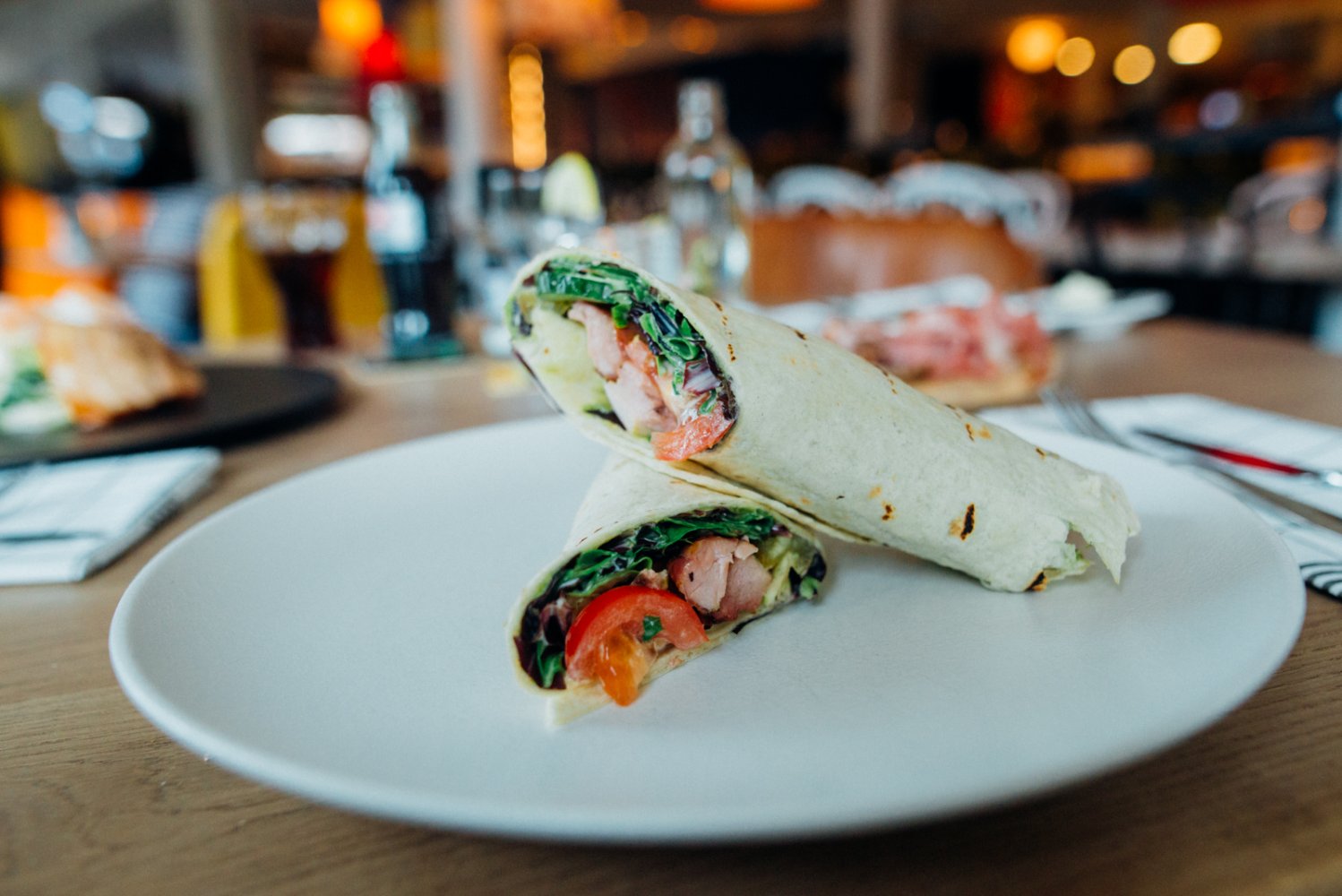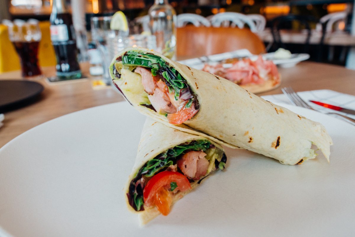 Het oog van mijn collega en mede foodie viel op de tortilla's. De overheerlijke tortilla's waren gevuld met gemarineerde kippendijen, mesclun salade, mexicaanse guacamole, tomaat en komkommer. De kippendijen waren heerlijk mals en hadden een pure gerookte smaak. Dat in combinatie met de komkommer, salade en de tomaten zorgde juist voor een geweldig frisse smaak met een licht pittig randje door het pepertje was hieraan was toegevoegd. Met dit lunchgerecht hoef je niet bang te zijn dat je nog trek hebt na afloop en het waren dan ook goed gevulde tortilla's!
