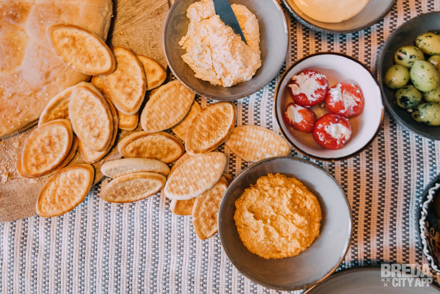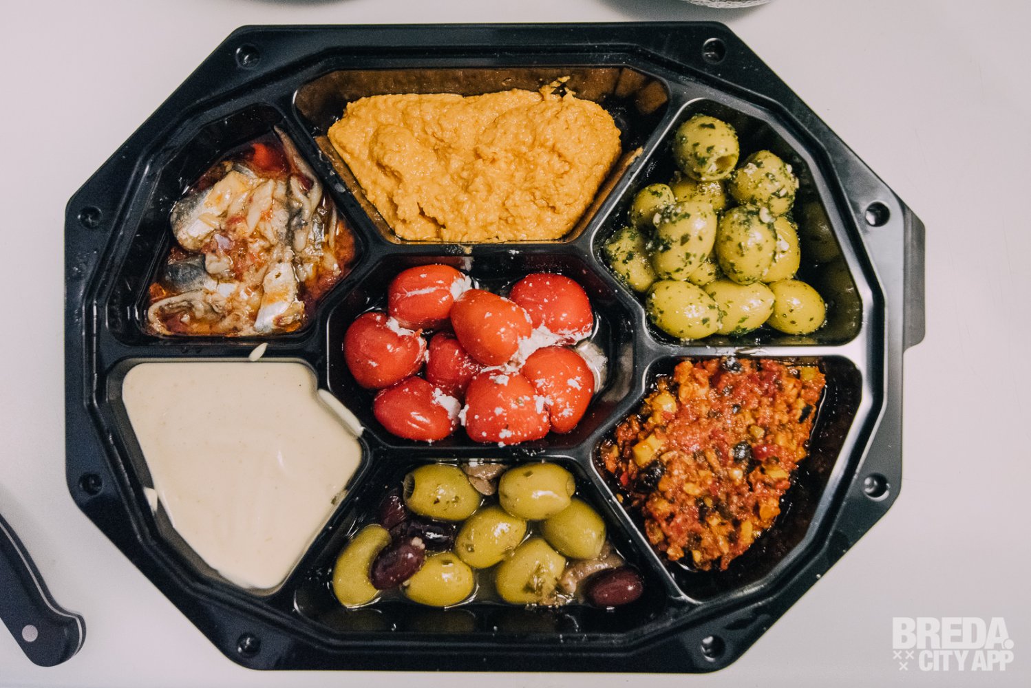 Tijd om aan te vallen! Op tafel zien we olijven met cashewnoten met pesto en de cocktail kalamata: een olijvenmix met knoflook. Hier starten we dan ook mee. De olijven smaken heerlijk en je proeft echt dat ze vers zijn! De olijven met pesto hebben we nog niet eerder gehad en zijn voor ons een zeer aangename verrassing. Hierna nemen we allebei een gevulde peppadew, dit is een pepertje gevuld met roomkaas. De pittigheid van het pepertje zal vast wel meevallen, maar niks is minder waar. Dit is écht een goed pittig pepertje, maar in combinatie met de roomkaas is 'ie goed te doen.