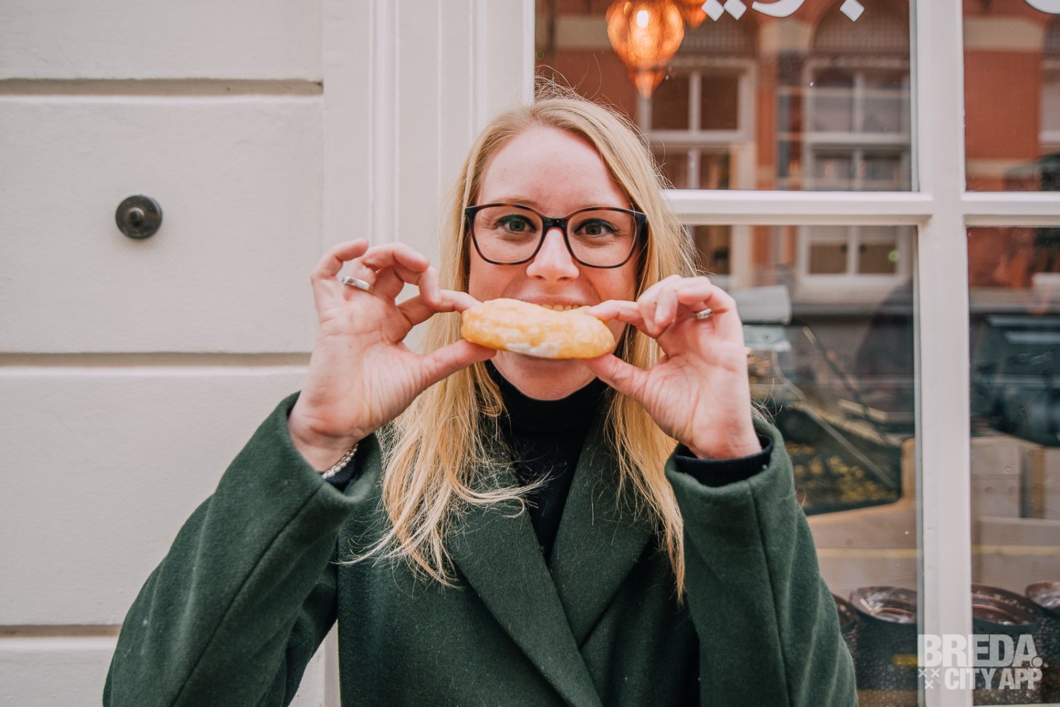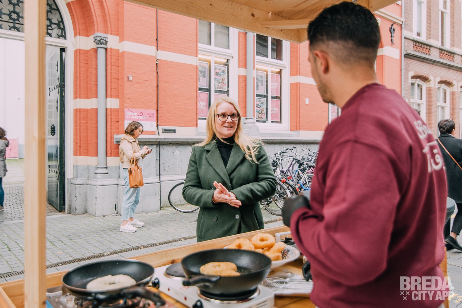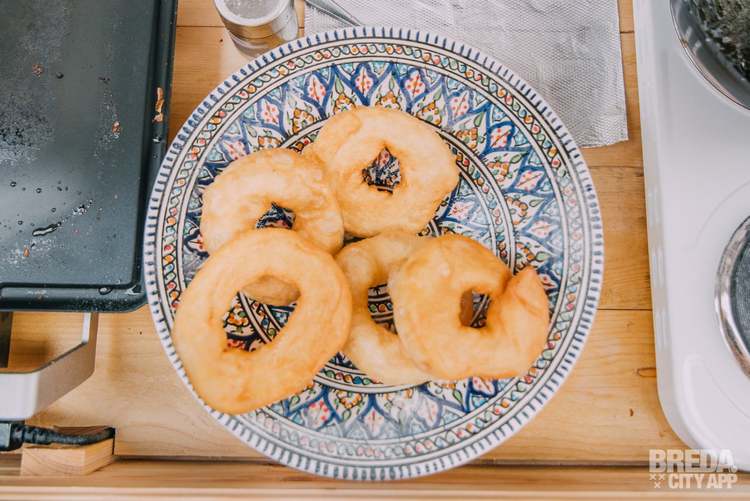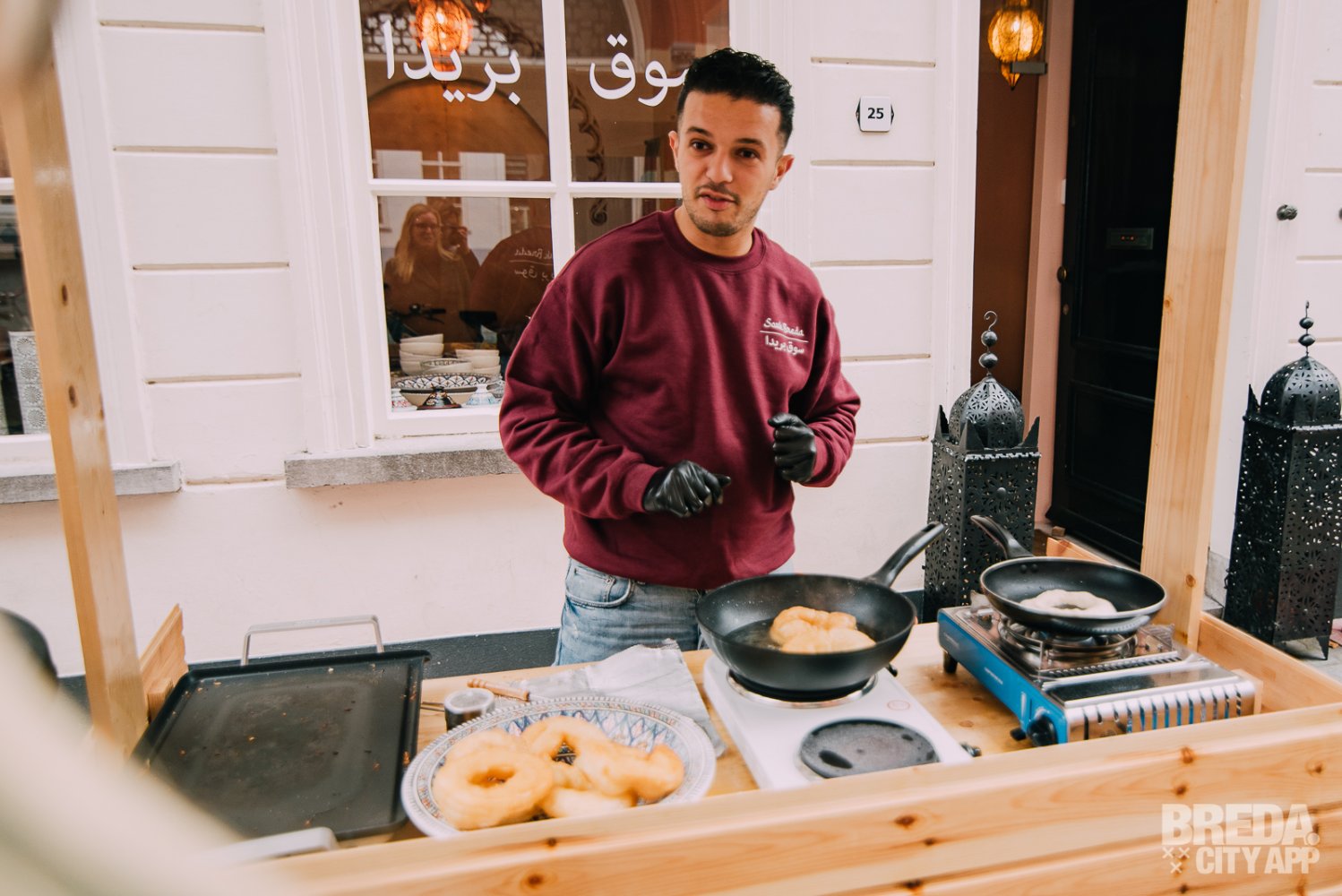 Wanneer we de St. Janstraat in wandelen zien we Soulimane al achter de gezellige Souk kraam staan. Elke zaterdag verkopen ze hier heerlijke en ambachtelijke Marokkaanse lekkernijen, waaronder msemmen en sfenj. Die laatste proeven we vandaag! Soulimane vertelt ons dat zijn moeder dit vroeger al voor hem maakte. De sfenj is een soort Marokkaanse gefrituurde donut en heeft ook wel iets weg van een oliebol. Soulimane bereidt deze vers voor ons en we gooien er net als bij een oliebol een goede hoop poedersuiker overheen. Jum! Een goed begin wat ons betreft.