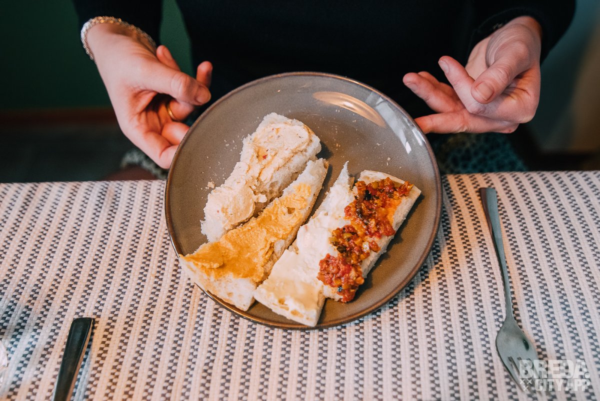 De verschillende smeersels trekken al gauw onze aandacht. We hebben de pikante humus, aioli met saffraan (mygod!), de tapenade oriëntal en een paprika roomkaas. We proeven het brood met de smeersels en concluderen beide al gauw dat we lang niet zulke lekkere smeersels gegeten hebben. De aioli met saffraan is een populaire bij Souk en wij begrijpen meteen waarom! Ook de andere smeersels zijn echt goddelijk, je proeft dat alles vers gemaakt wordt en dit is dan ook zeker niet te vergelijken met een bakje humus uit de supermarkt.