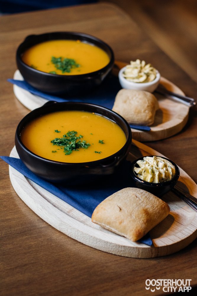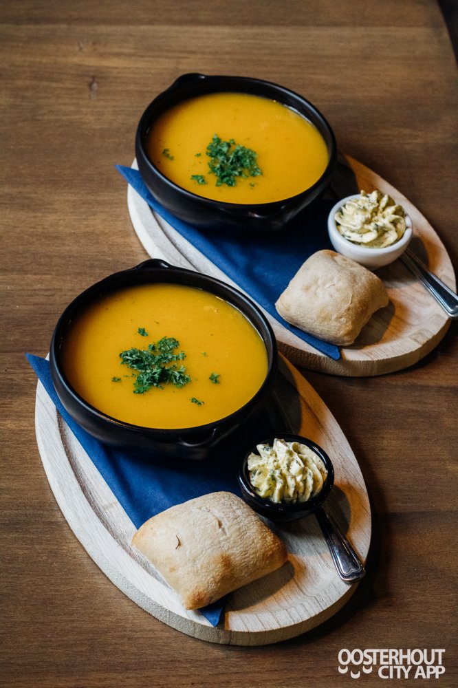 Niet veel later krijgen we de pompoensoep met fijn gehakte peterselie uitgeserveerd. Naast de soep ligt een warm witbroodje met goede smeerbare kruidenboter. De soep heeft een subtiele pittige smaak en geeft je een knus winter gevoel. De soep heeft een fijne structuur en is een aangename starter met een prettige bite.