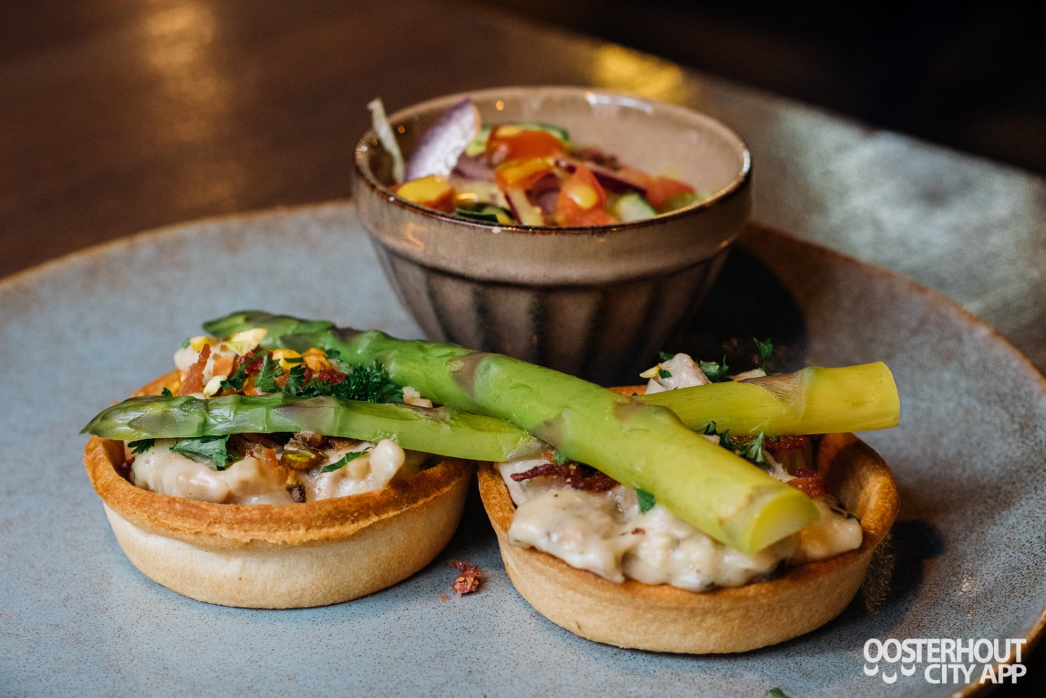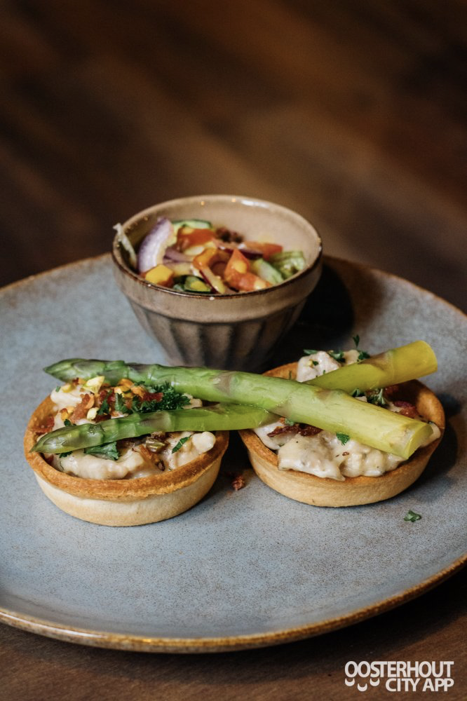 Ondertussen zie ik dat de zaak vol loopt met andere gasten en al snel zit dehele Brasserie vol. De tweede gang van de proeverij volgt. Het is een pasteitje van de oude kaart gepresenteerd in een nieuw jasje. Twee tartellete vormpjes gevuld met verse salpicon van kip, groene asperges en rauwkost. Dit gerecht is een hardloper en dat snap ik direct. Een feestelijk plaatje!