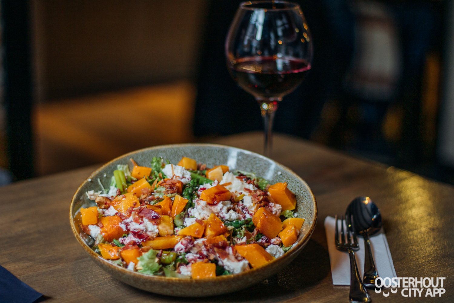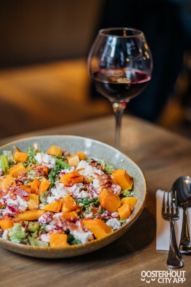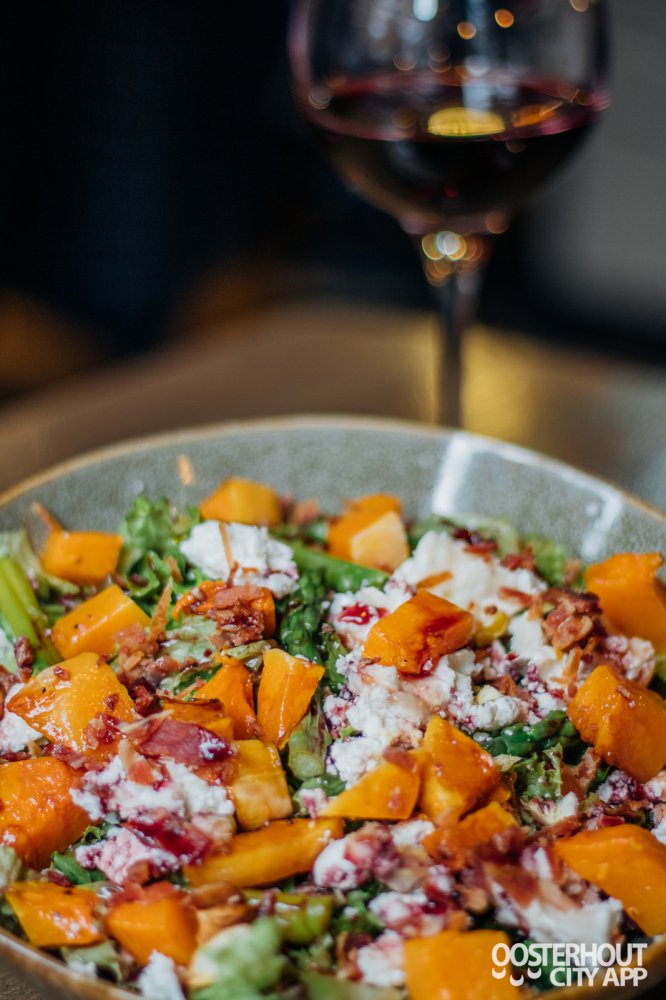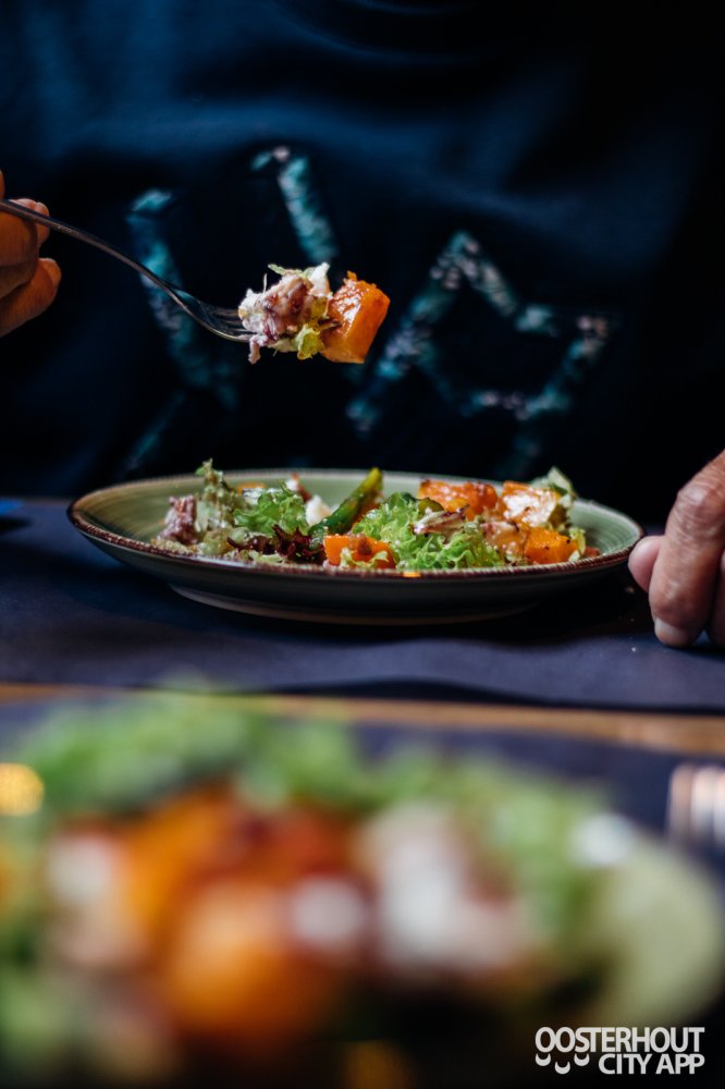 Bij de volgende gang krijgen we een soepele rode wijn en een goed getapt Hertog Jan pilsje. Kort daarna volgt de Herfst salade met gepofte kastanjes,gevuld met geitenkaas, groene asperges en een rode-port stroop. Een goedgevulde salade die helemaal past in het seizoen. Echt een topper! De zorgvuldig bereide en gekozen ingrediënten zorgen voor een waar feestje voor de smaakpapillen, de zoete smaak in combinatie met gepofte kastanjes zorgen voor een fijne samenhang waardoor je niet kan stoppen met eten van deze salade.