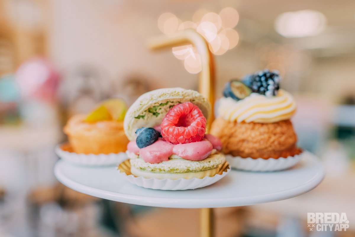 Na alles in de zaak bekeken te hebben zijn wij klaar voor de tweede ronde met een feest- en geluks-thee. We krijgen nu een prachtige etagère door Judie zelf geserveerd met uitleg over al het lekkers. Als eerste de macaron met framboos en limoen die precies goed is. Knapperig van buiten en zacht van binnen.