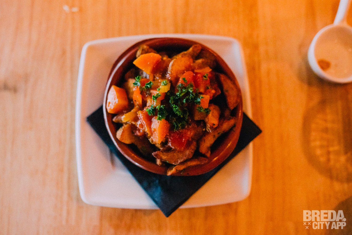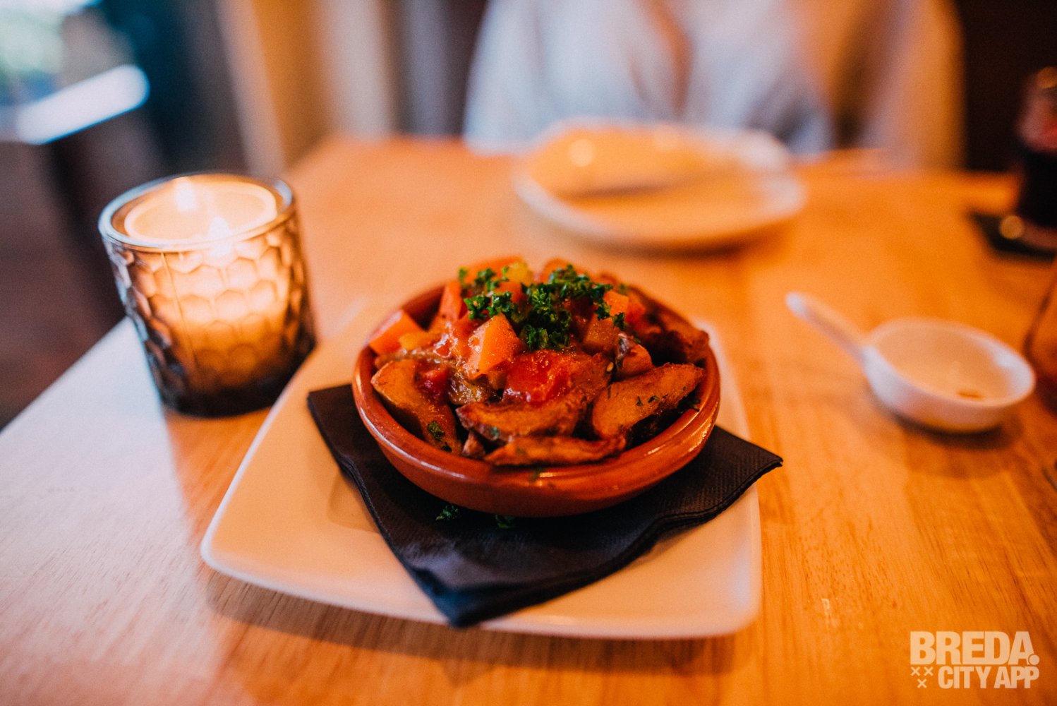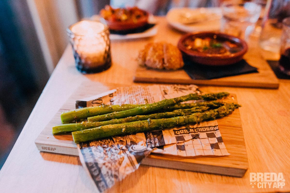 Als de tapas van de eerste gang iets gezakt zijn is het tijd voor de volgende gerechten. Voor ons worden Gergrilde Groene Asperges en Brave Patatjes, ofwel de Patatas Bravas, neergezet. De asperges zijn gemarineerd in Toscaanse kruiden, welke een aparte, aar lekker verrassende smaak geven. De patatas bravas worden geserveerd met een pittige tomatensaus.