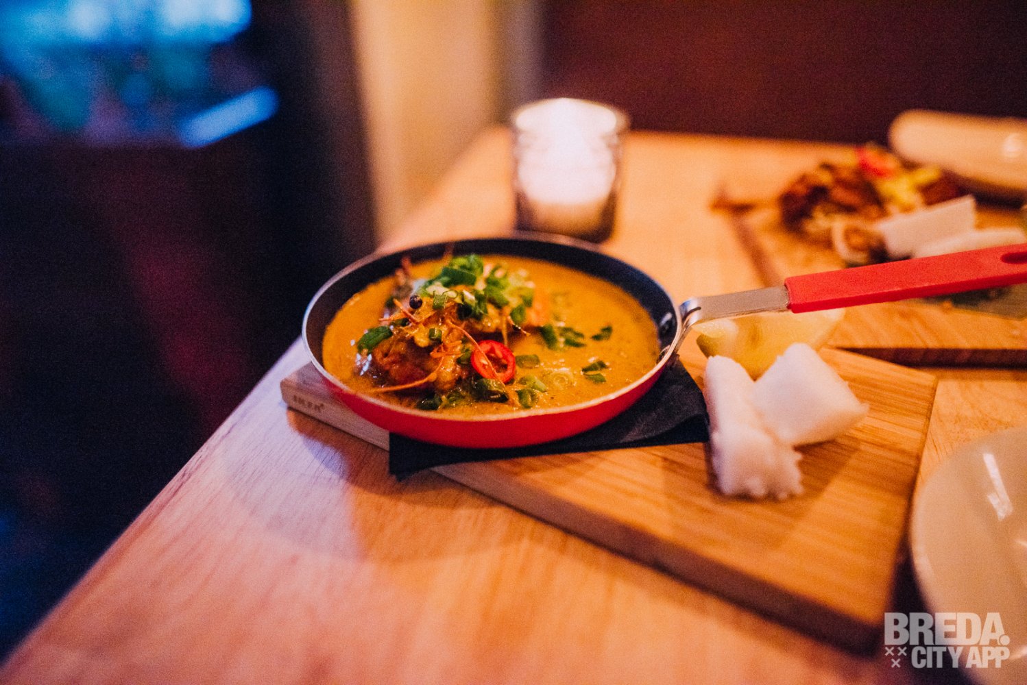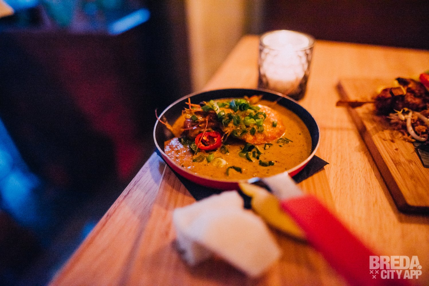 Na nog even wat gedronken te hebben worden de laatste warme gerechten alweer geserveerd. We krijgen de A.P.K. Spies, twee kipspiesjes van kippendijfilet, Truffelkroketjes en Gamba's al Curry, gamba in een Thaise curry-kokossaus. Stuk voor stuk erg lekker.
