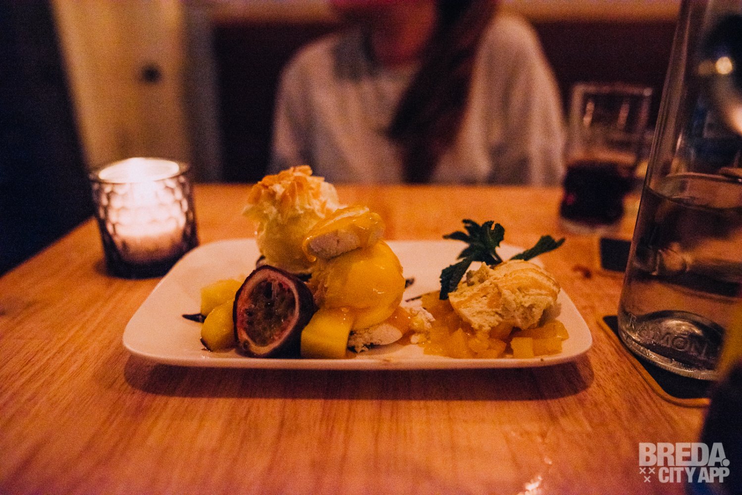 Aan al het moois komt een eind en zo ook aan deze proeverij. We krijgen als laatste het dessert genaamd Keuzestress. Dit is een combinatie van alle toetjes die Plan B op de kaart heeft staan. Op het bord dat geserveerd wordt ligt postre, passievrucht sorbetijs met stukjes mango en kokosroom, een koekje met chocolade en karamel, witte chocolademousse met lavendel, ananascompote en kokosfudge. Een echte aanrader voor de fruitliefhebbers!