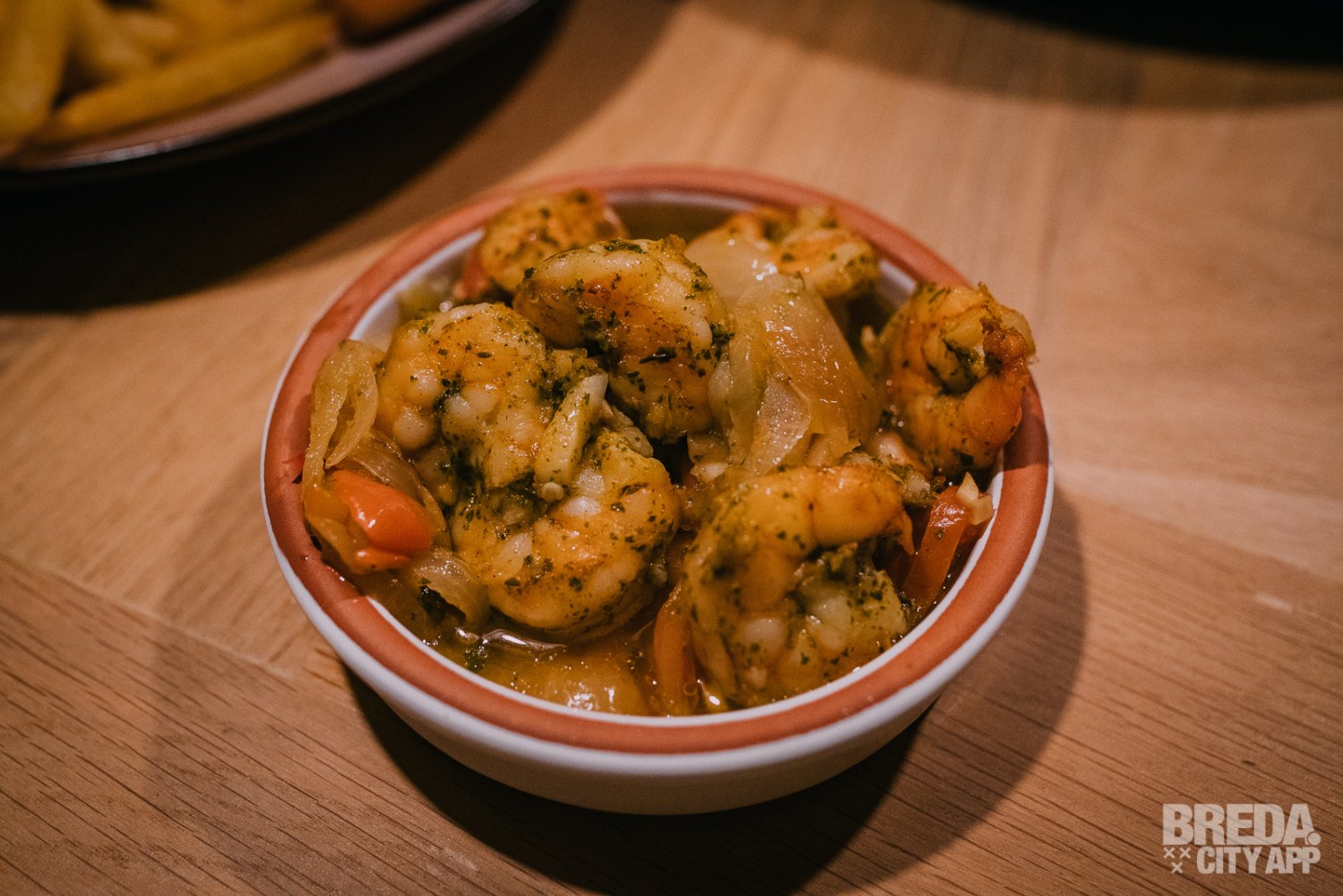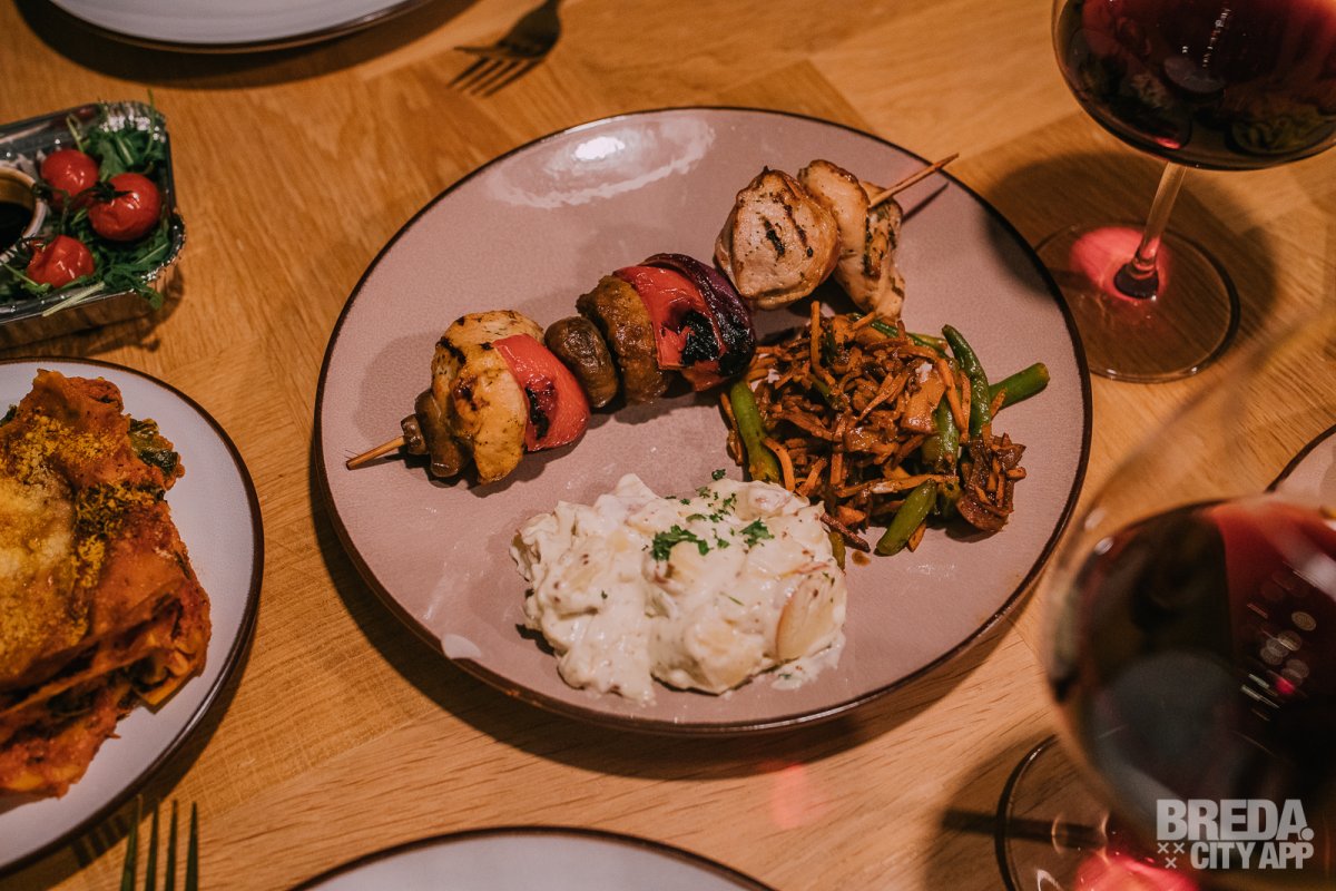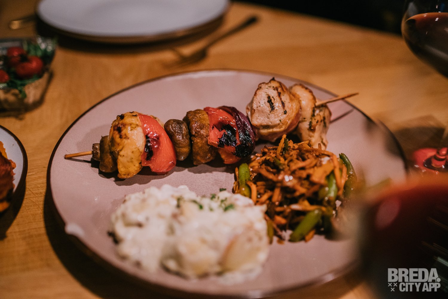 Als hoofdgerecht hebben we gekozen voor de mixed grill spies van kalkoen, Black Angus-burger, varkenshaas, spek, scharrelkipfilet, champignons, paprika en ui. Deze wordt geserveerd met aioli, kartoffelsalade en boontjes. Hierbij drinken we een heerlijke rode wijn van Whiplash uit de Jamieson Ranch in Californië. Deze volle wijn heeft aroma's van donkere bessen, toffee, kaneel een een vleugje peper.