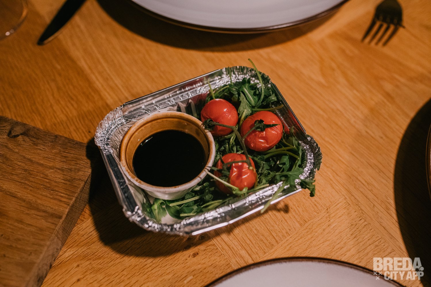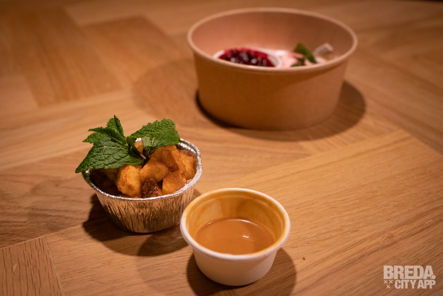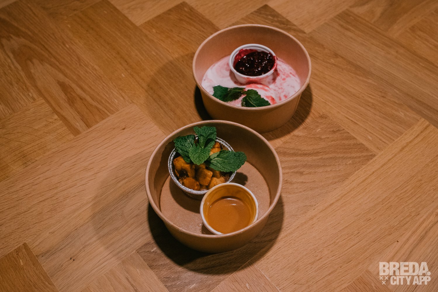 Als dessert hebben we een chocolade fondant met vruchtencompote en de crumble met appeltjes van Landwinkel de Woerdt. De chocolade fondant is heerlijk romig en luchtig, wat erg lekker is met de frisse vruchtencompote. De apple crumble wordt geserveerd met een overheerlijke karamelsaus. Een gouden combinatie en een heerlijke afsluiten van dit fantastische diner.