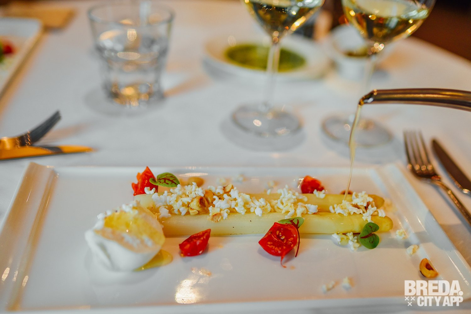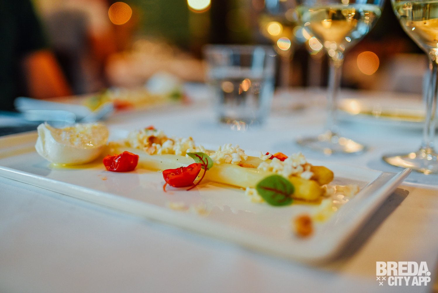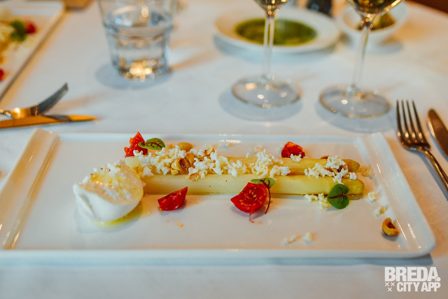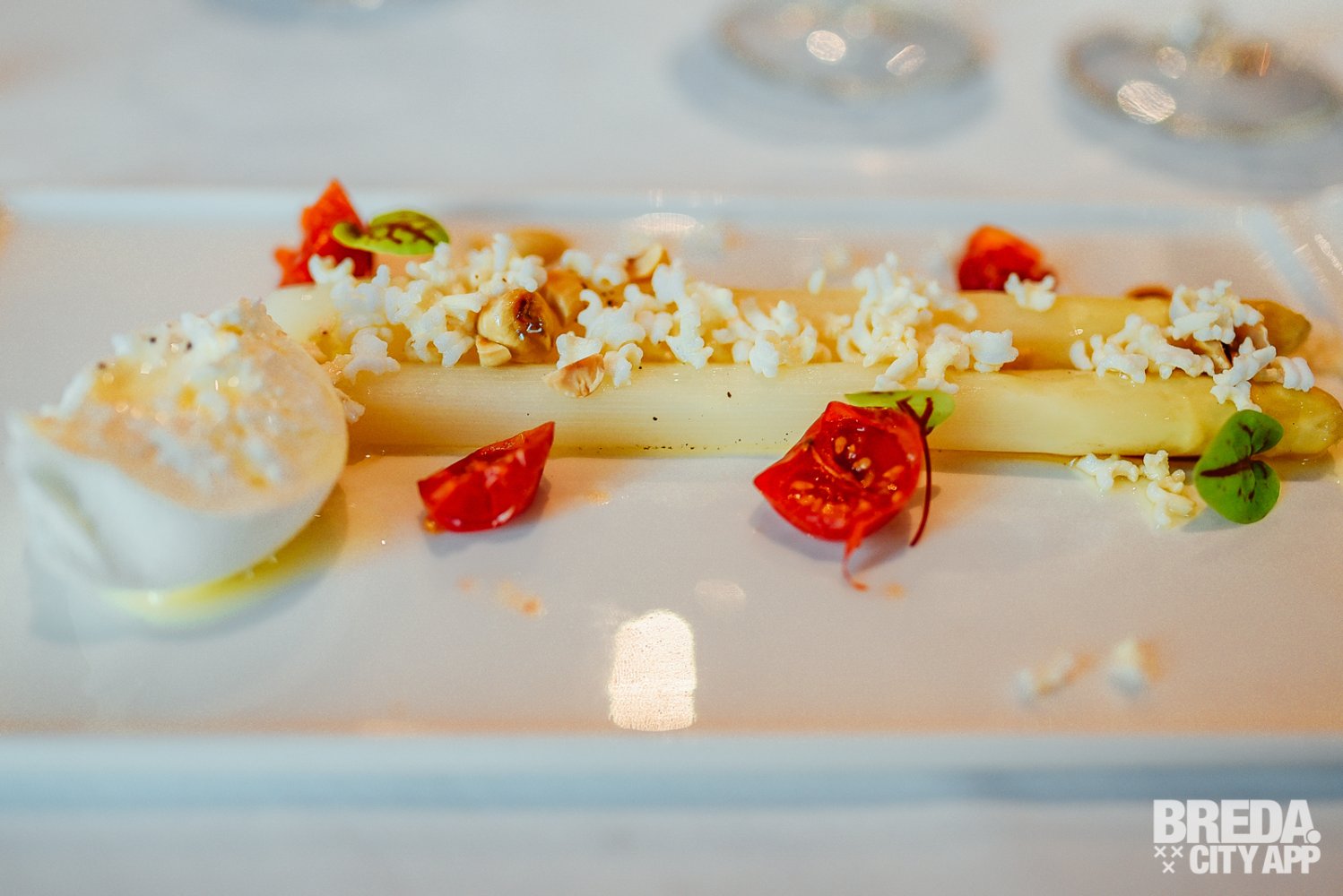 Het eerste tussengerecht is boterzachte burrata met asperges en geroosterde tomaat. Hierbij wordt gepofte carnoli rijst geserveerd en aan tafel schenkt Robin een heerlijke hazelnotenolie over het geheel. We drinken hier twee witte wijnen bij. Één uit Friuli en één uit de Veneto. Waar de eerste wijn bloemig en aromatisch is, proeven we bij het tweede glas de volle en ronde tonen die goed passen bij de wat zwaardere ingrediënten van dit gerecht, zoals de hazelnoot.
