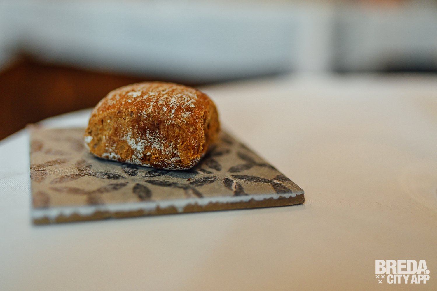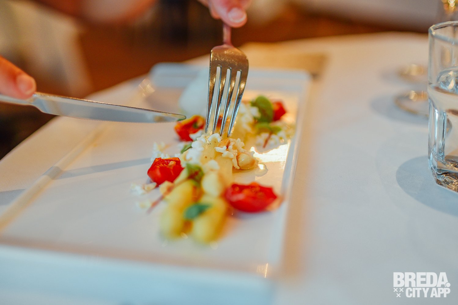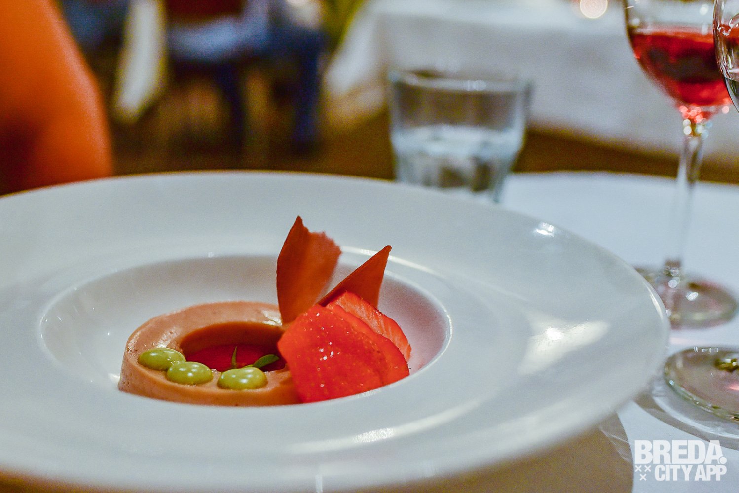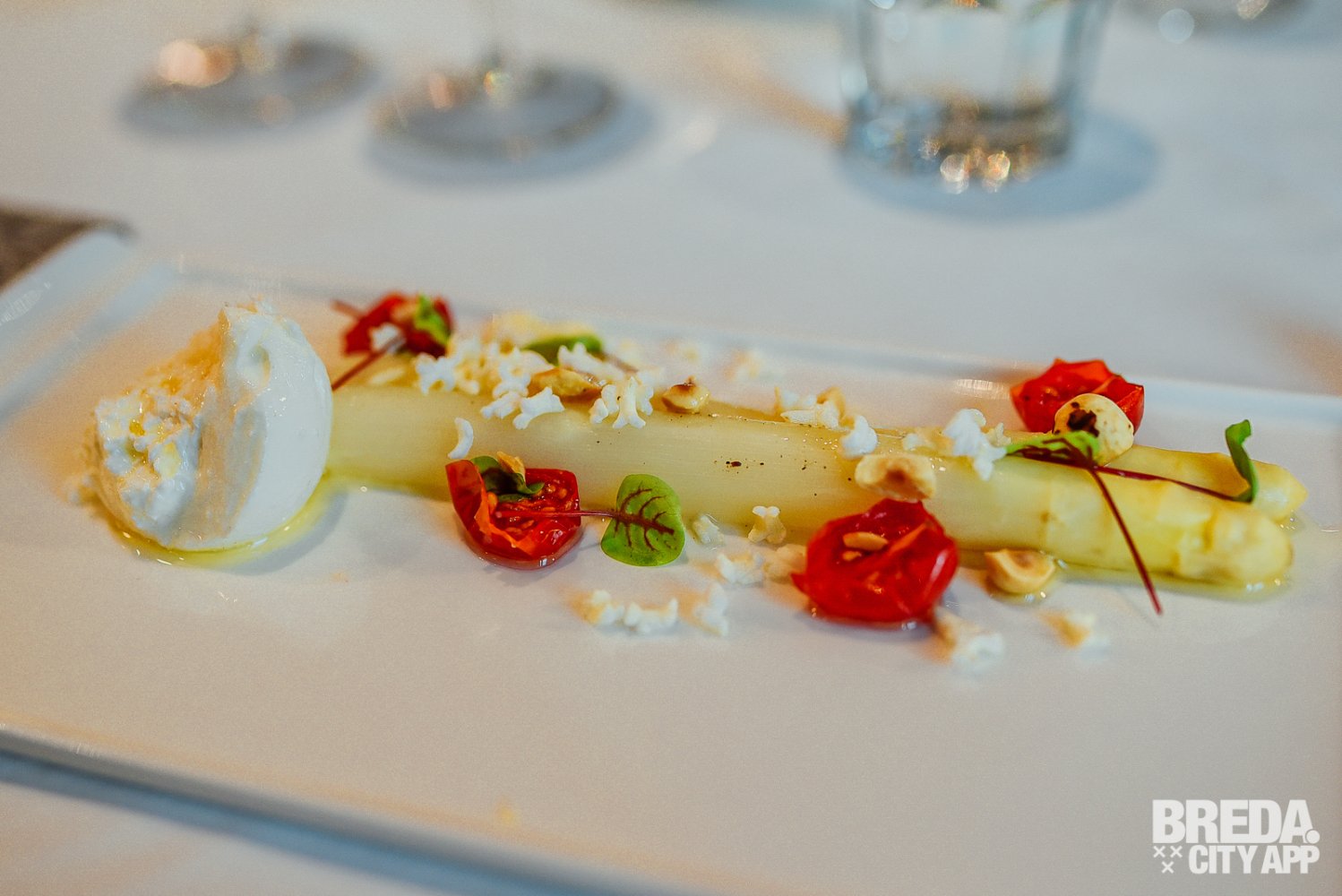 Het eerste tussengerecht is boterzachte burrata met asperges en geroosterde tomaat. Hierbij wordt gepofte carnoli rijst geserveerd en aan tafel schenkt Robin een heerlijke hazelnotenolie over het geheel. We drinken hier twee witte wijnen bij. Één uit Friuli en één uit de Veneto. Waar de eerste wijn bloemig en aromatisch is, proeven we bij het tweede glas de volle en ronde tonen die goed passen bij de wat zwaardere ingrediënten van dit gerecht, zoals de hazelnoot.
