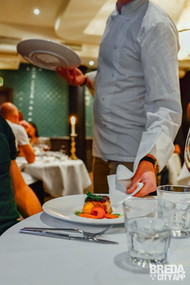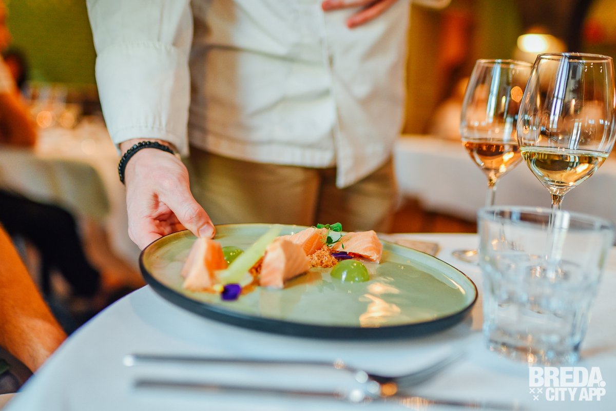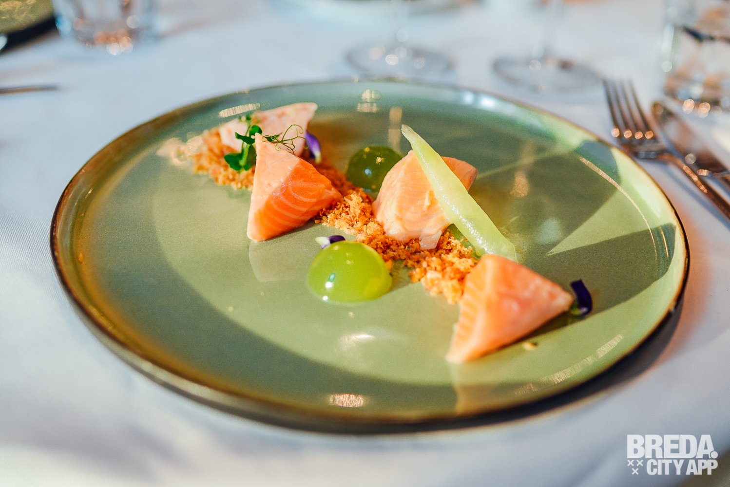 Het voorgerecht wordt geserveerd, dat bestaat uit zalm gemarineerd in gin en tonic, met crumble van gedroogde tonijn en zoute citroen. De volle en verse smaken van deze ingrediënten gaan mooi samen in combinatie met de gelei van komkommer die het geheel wat frisser maakt. Terwijl de prachtige opgemaakte borden op tafel verschijnen wordt er nog wat extra gin over het voorgerecht gesprayd. Dat is een leuke verrassing!